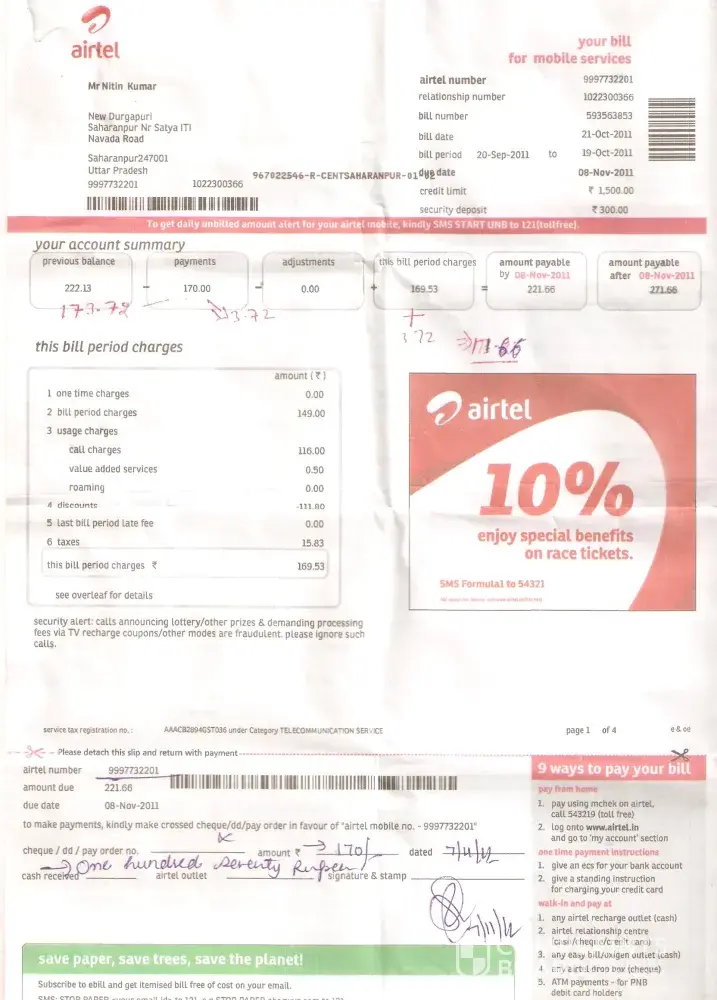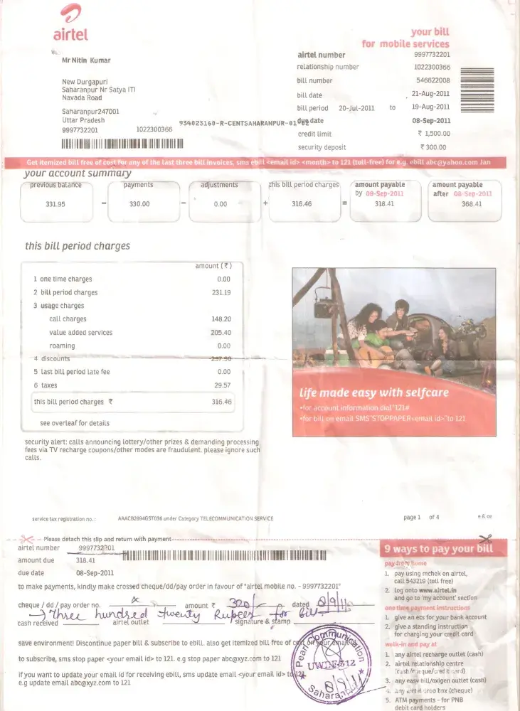 Airtel Bill for period: 20/07/11 - 19/08/11; Due Date: 08/09/11; Amount: 487.98/-