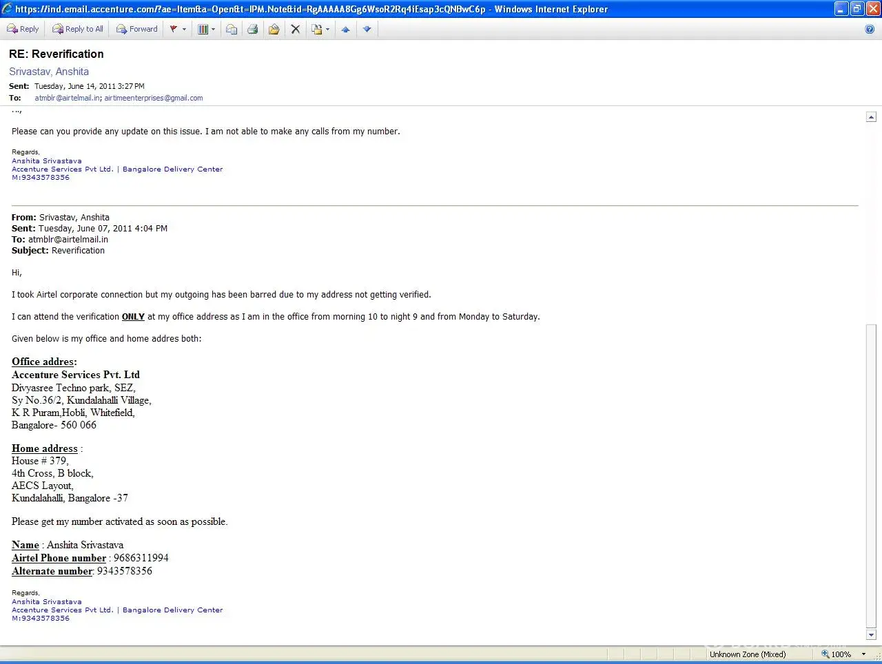 I took Airtel corporate connection but my outgoing has been barred since 8 days due to my home address not getting verified. i lodged this complaint with the executive and it has been more than 10 days that nobody came for verification. the executive from whom I took the connection is Sheshadri (mob: [protected]). I was asked that I should drop a mail and my reverification will be done. I was told daily that the executive for reverification will come tomorrow. i mentioned the time when I can be available at home but nobody ever came. Nothing happened for 10 days, nobody came for the reverification and now my incoming is also barred. I have tried talikng to this man but he doen't take my call now and my number is inactivated. i have atteched the mails that I repeatedly sent and recieved no response.