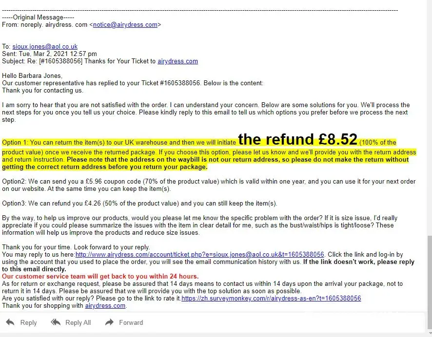 Desired outcome: A FULL refund of the amount paid for the garment and postage