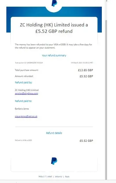 You've sent a payment of £29.15 GBP to ZC Holding (HK) Limited ([protected]@airydress.com)