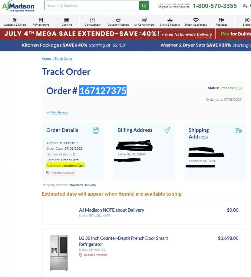 I was trying to order a washer from AJ Madison, and after a whole week went by without hearing anything, I decided to check the order status. But when I looked at their site, my status wasn't even listed! I had no idea what was going on, so I submitted a ticket to try and get some answers. But guess what? No response from anyone. So I checked the status online again, and it had magically changed to 'Processing'. I waited another week, but still no one contacted me and the status was still the same. So I decided to call them up and see what was going on.