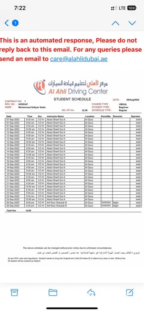 al Ahli driving school is worst school in UAE management, schedule, classes, instructors, everything. if they cannot manage, control, fulfill the requirements of students, if they cannot provide on time classes as per student’s schedule, then better they should shut their business, in every stage till final RTA test they wasted my around 60 days, I wasted such a long time, especially in UAE where every minute has value.