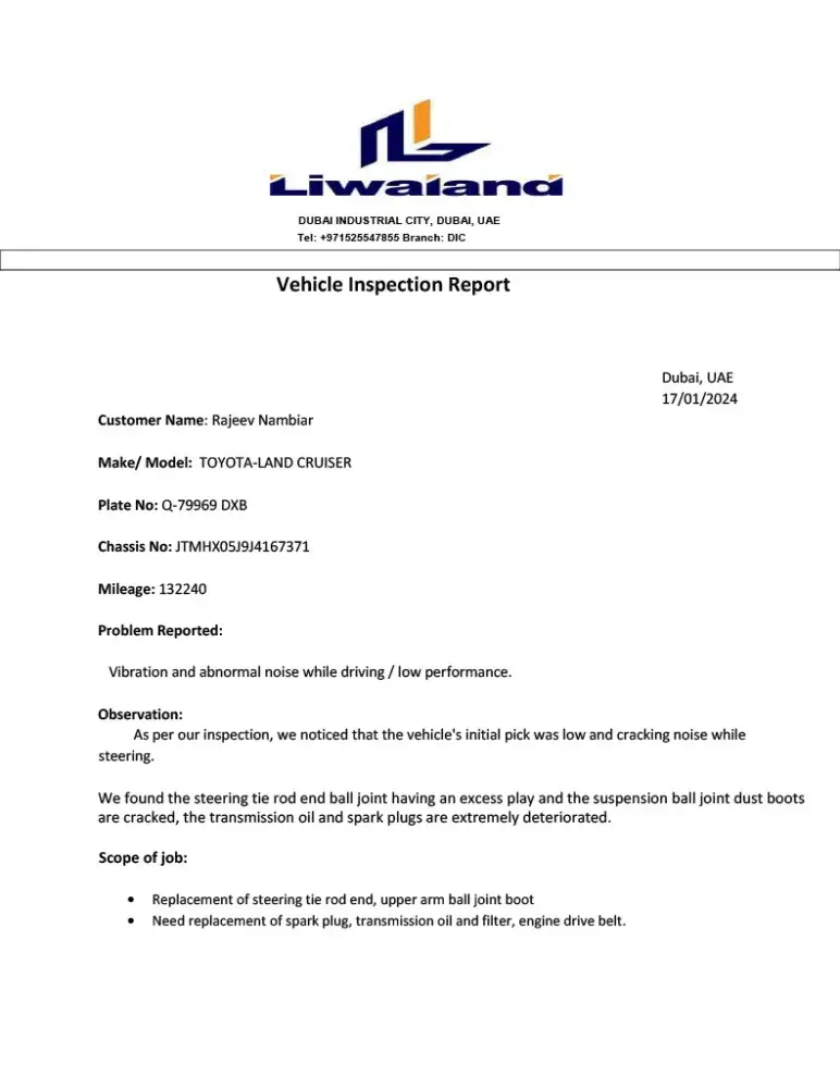 Car was inspected by a local garage and found spark plug had gone bad and not inspected by Al Futtaim. Even the gear oil was in a very bad condition. I am attaching the report.