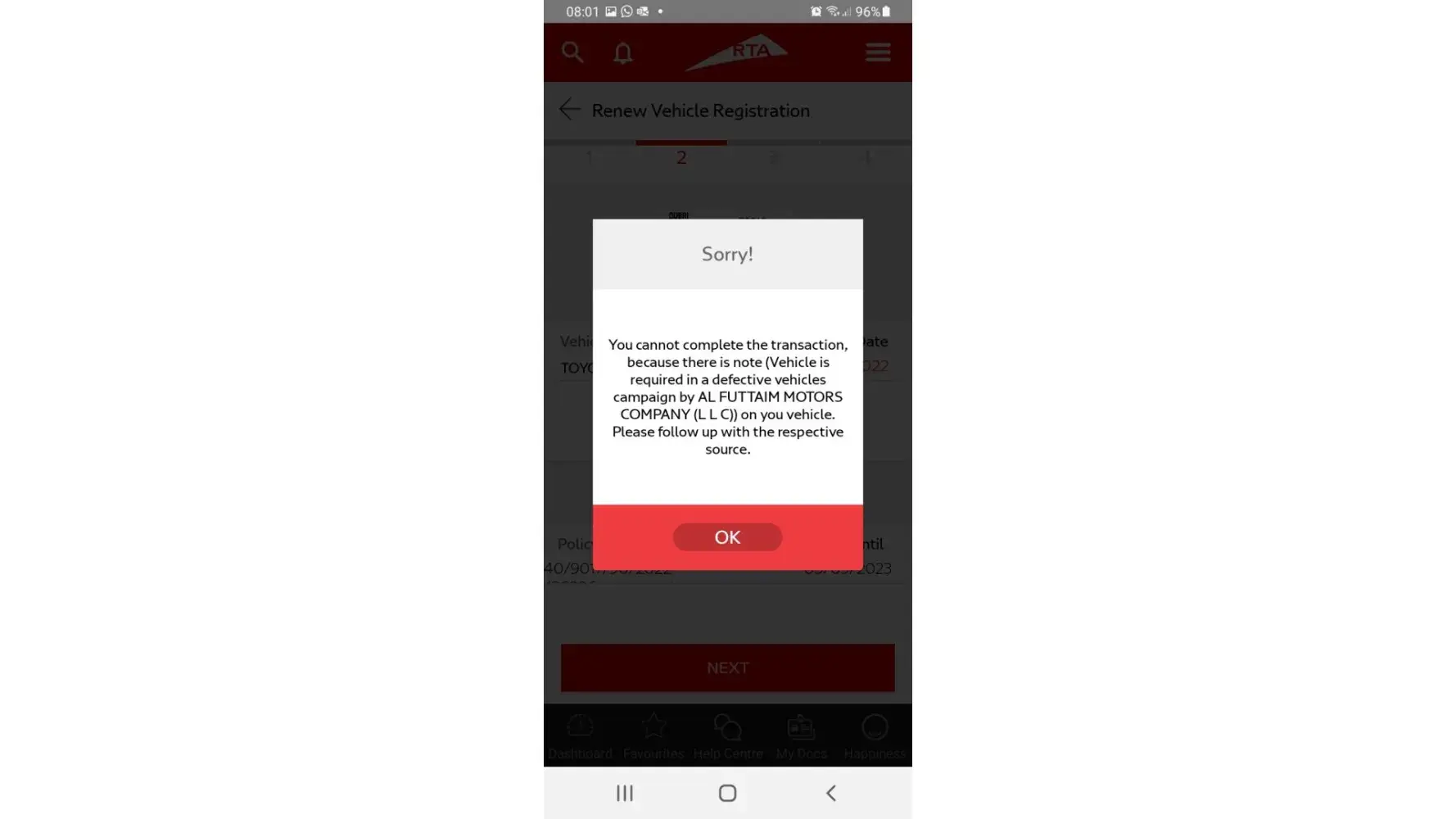 Today 07.08.2022 I went for my YARIS renewal,after getting pass in RTA system showing Your vehicle is under defective list and contact Al Futtaim.
