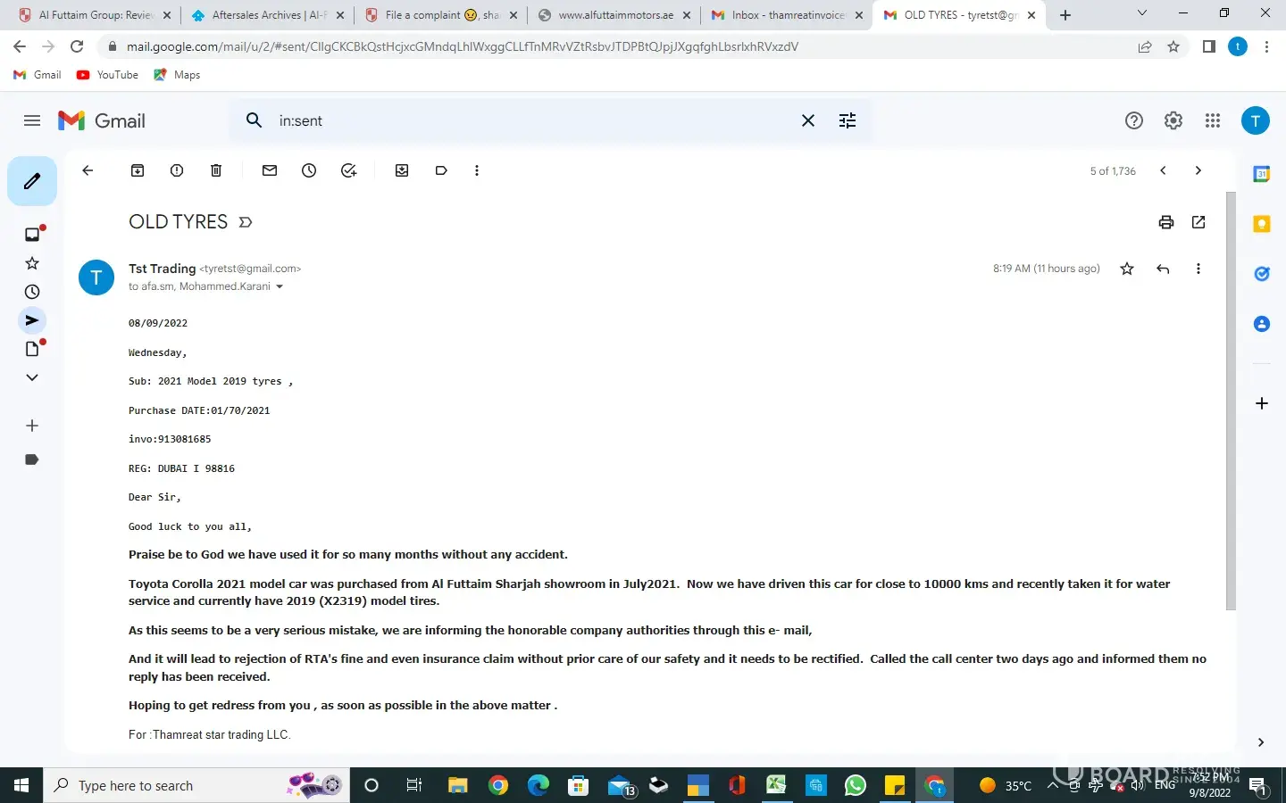 I would like to raise an issue and encountered situation regarding the pre-owned vehicle that I bought from Al Futtaim Automall in January 2019. Toyota Yaris 2015 model. Indeed, it was clearly mentioned that this vehicle had 0 accident. However, I have decided to sell the vehicle after 3 years and after completing the inspection to estimate the car value for resell, the price given was very low compared to the amount I paid to buy the vehicle, almost 45,000 AED car value, I did a loan for 5 years to buy this vehicle. The report came to me and I was completely surprised when I discovered that this vehicle had 5 accidents in 2015, 2016, 2017 and the full body of the car is repaired and repainted. It's very disappointing as I did a personal loan and this information was never given to me or else will not buy this vehicle in 2019. The car value is very low compared to the price I paid. Please refer attached to all documents and online accident report for your consideration.
