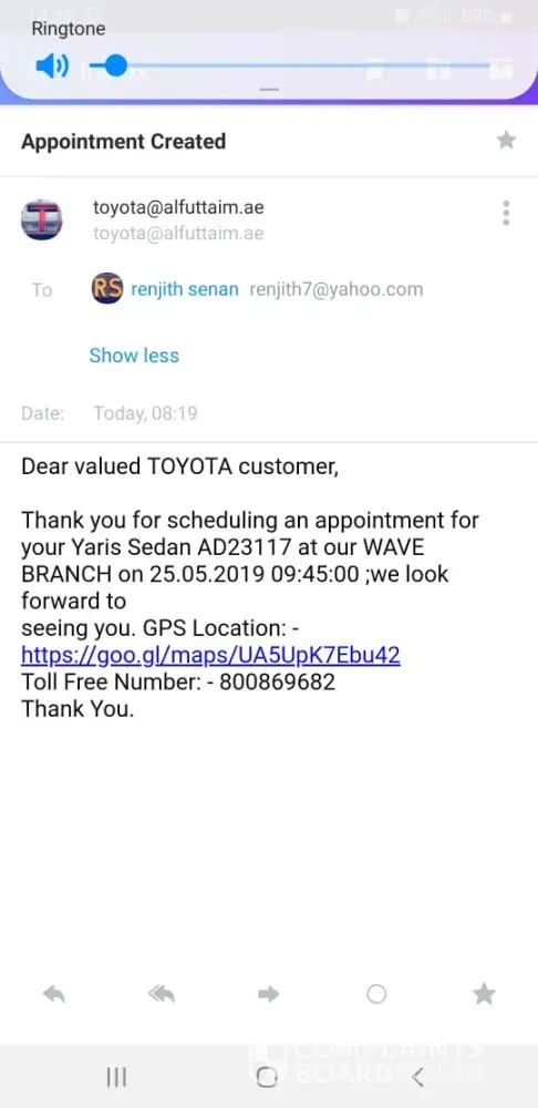 I waited for a approx. more than a week and since there was no response I raised complain on 10th July 2019 over customer care with complain number 8000043586. I recently got reply form Customer happiness center that my claim is been rejected and Al Futtaim Toyota can't help me.