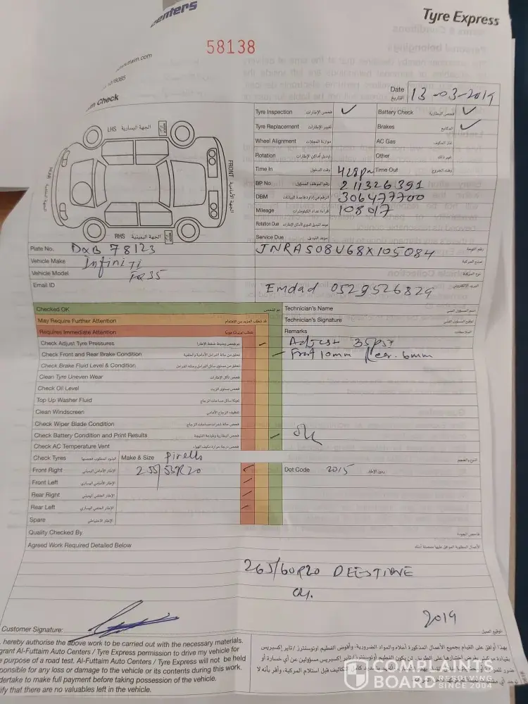 I hope to hear back from you, i can reached by phone the number given below the tyre rotation will be keep pending if there are no resolution i ensure not to visit anymore any outlet of tyre express