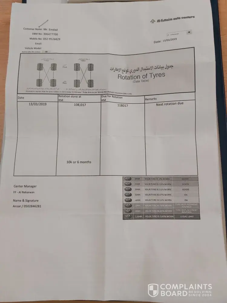 As a dedicated customer i hope you will work to resolve my problem and find a resolution.please find a attached copy of purchasing Nos 4 Tyre's from tyre express on March 13, 2019 with a promising tyre rotation free of service in every 10000 km.