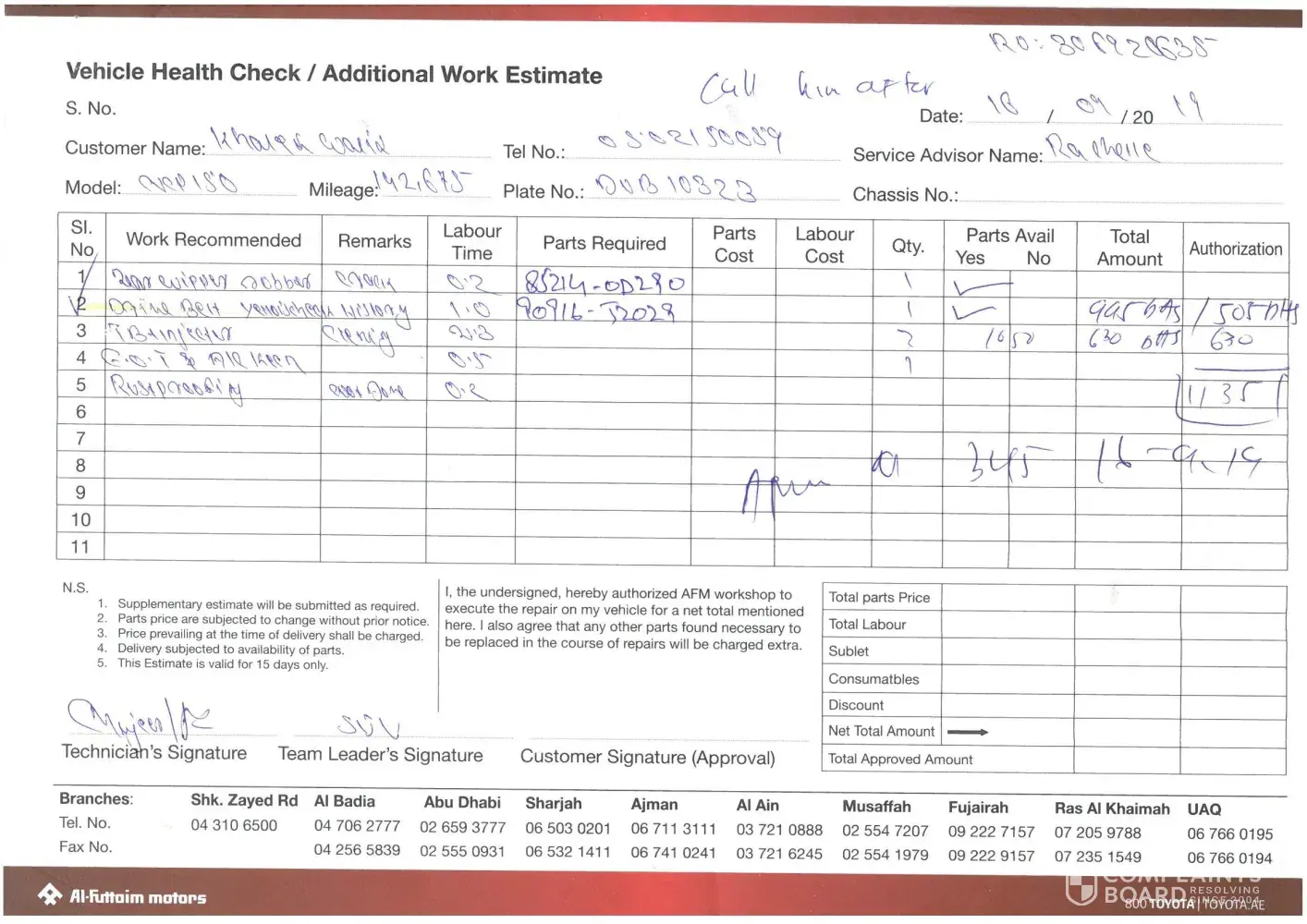 After the service was done, the driver picked-up the car. Upon driving, the driver noticed a sound coming from the car and called Al Futtaim team accordingly, informing them of the issue. He was advised to wait for a call back from their team, as they needed to check and assign an appointment for him. They never called back. Yesterday, 09.10.2019 we still received no call from Al Futtaim. The driver straight to the service center, the car was checked and we were advised that yet another part needed to be changed.