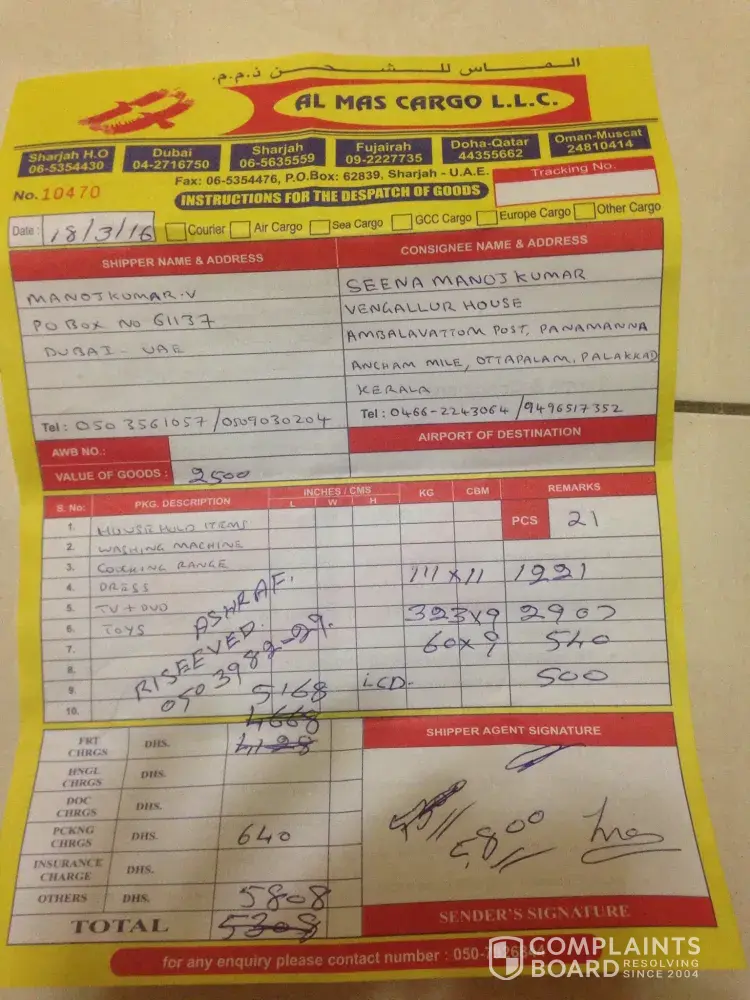 Thank you for your feedback however, we are unable to verify any of the information you have described nor can we locate your name in our client database. We take customer feedback very seriously so if you contact our manager directly at info@almasgroupuae.com so we can resolve this issue as a matter of urgency. Many thanks. Support Team - AL MAS CARGO.