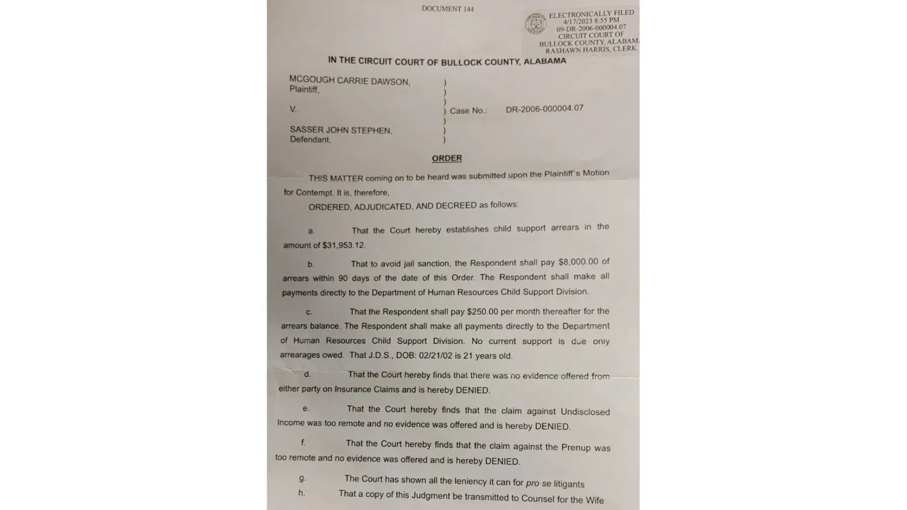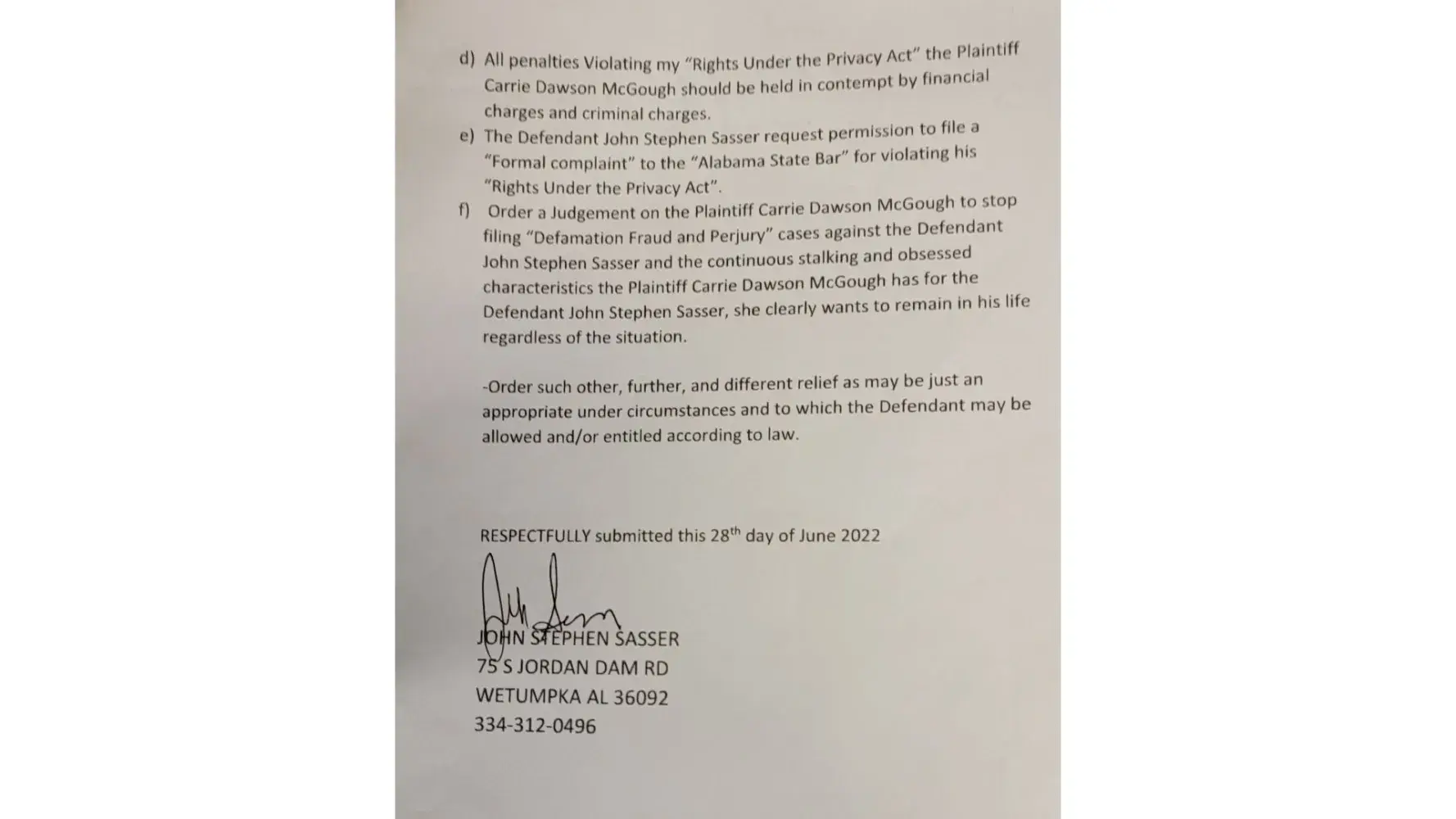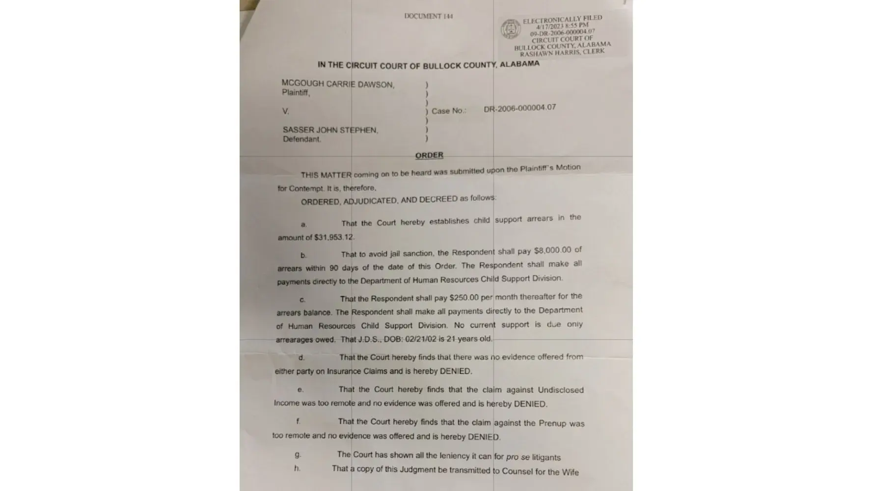 The defendant john sasser has filed multiple court cases against his ex-wife carrie mcgough (plaintiff) with judge smithart of bullock county. The plaintiff and her family are well regarded within the county and with clear and 100% truth documents filed the defendant is always denied. Carrie mcgough is a millionaire and has never kept a job in over 17 years. Attorney clay teague larry sasser and carrie mcgough mailed private documents to a mutual friend of the defendant., clear violation. Orders made by judge smithart with preup and divorce papers agreements are not upheld and dhr of elmore county refuses to meet with the defendant john sasser. The plaintiff carrie mcgough owes over $79,000 in health insurance coverage to the defendant.