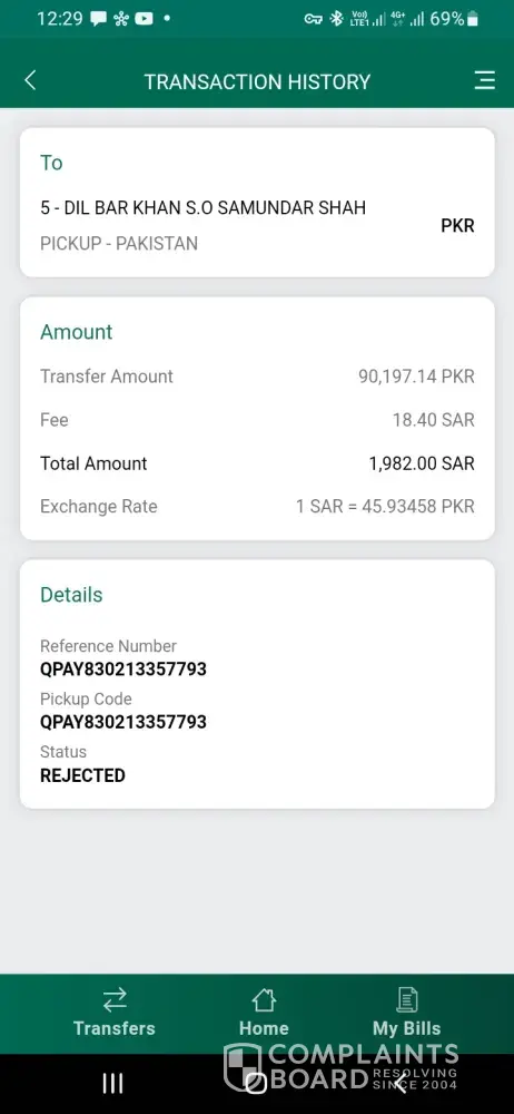 As I send money 2526 SAR to Pakistan on Bank al Habib on 30/04/2018.But still i have not received money in Pakistani have put a complaint in the same quick pay bank but the issue is not yet solved .