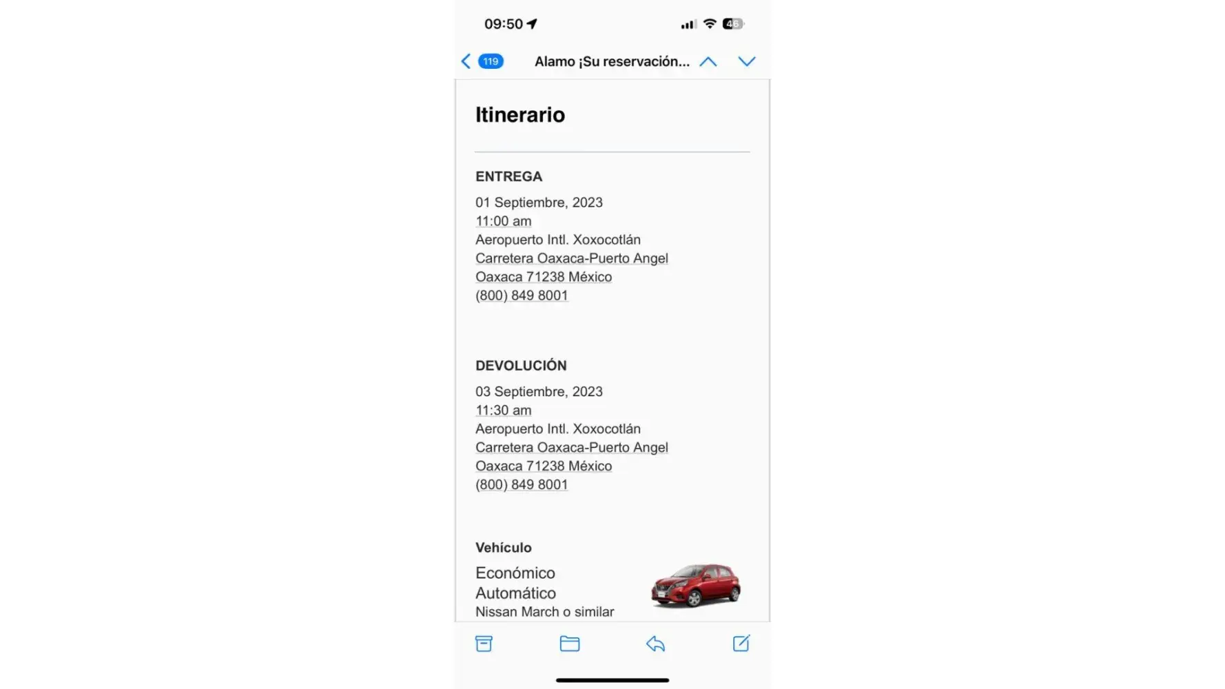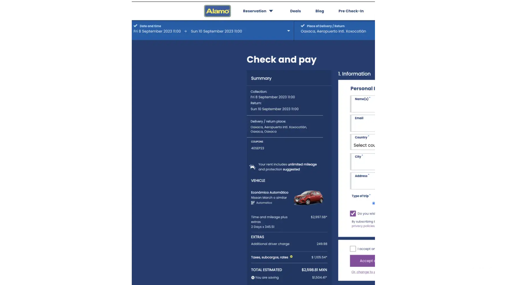 Overcharging/inconsistencies.. Charging for 3 days instead of 2. Car was reserved for 11 am, was returned at 11:00 am on Sept 3... please find attached copies of contract, Check in and out, Mr. Hernandez was charged Mexican Pesos 3669.63... charges should have been much lower based on advertising and 2 days. please respond to [protected]@gmail.com... I am also writing several emails to CEO with copies to [protected]@alamo.com and Mexico office