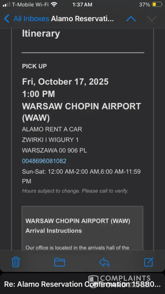 #1588082245 confirmed on 17 October 2025 at WAW airport Name Ugur Avcikurt . I walked to Alamo office . Employee told me that he can not rent me because I lack an International drivers licence. Then he said next door unknown car rental company would rent me with just my US Drivers licence that they don’t follow the rules. I checked and found an...