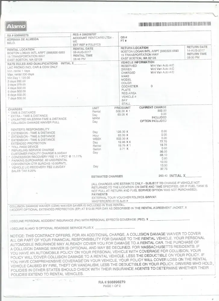 I did not have a good experi ence renting the Alamo car. I rented the car in Brazil, and according to the first rental agreement, passed to me by email, it did not talk about extra expenses. The day I picked up the car at Boston International Airport, the salesman who received me charged me for other fees and made me buy a toll pass that would be worth the car's rent every day. This seller did not tell me anything else about extra charges to pay for the tolls. Furthemore, the day I returned the car to JFK International Airport (08/14), I forgot my little purse in the driver's seat, which contained 400 dolars in cash, all my credit cards, my ID, and my driver's license. As soon as I realized that I had forgotten my little bag, I returned to the same place that I returned the car, I asked the manager for help. The rented car was already in the wash process. They brought the car for me to check and I no longer found my little bag. I was absolutely sure that I had left my little bag in the driver's seat. The boy who took my car to be washed was no longer at work. The manager Vincent Tanamal advised me to go back to the hotel and wait until the next day as they would check out the cameras installed in the return area and see which people got in the car. No one answered me by phone or email my request.When I returned to Brazil, where I live, I again contacted someone at the Alamo who could give me some feedback about the videos and about my little bag. The only person who helped me on the Alamo was Ms. Lisa Piscopo, who said she would check out the videos. Briefly, nothing was achieved and I was told that only I could be in touch with the stores that my cards were used. Since I had canceled all my stolen cards, you could not charge this extra (which I was not warned) about the tolls. I will not have any more damage to this luguel by car. Therefore, if you do not solve the theft of the small bag, I will seek legal aid. What I should have done on August 14, after I checked the car, was to call the police. In addition to not calling the police, you still want to charge me for tolls that I have not been told. When I rented the UNIT from you to stick at the windshield for the tolls, I thought that nothing else I would pay. YOU SHOULD HAVE TOLD ME ON THIS CHARGE EXTRA. No contracts have given me about toll fees. Therefore, I do not think I should pay the tolls because no contract gave me to read and be aware of. At that time I still asked the Alamo attendant if renting the drive to the tolls, I would have to pay something else. He reassured me that I would not pay anything more for tolls, that there would be many along the roads that would pass.
