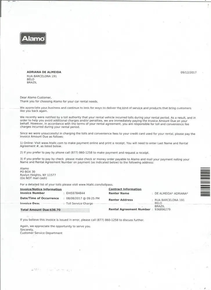 Attached follows the letter you sent me charging toll incurred during my car rental period.