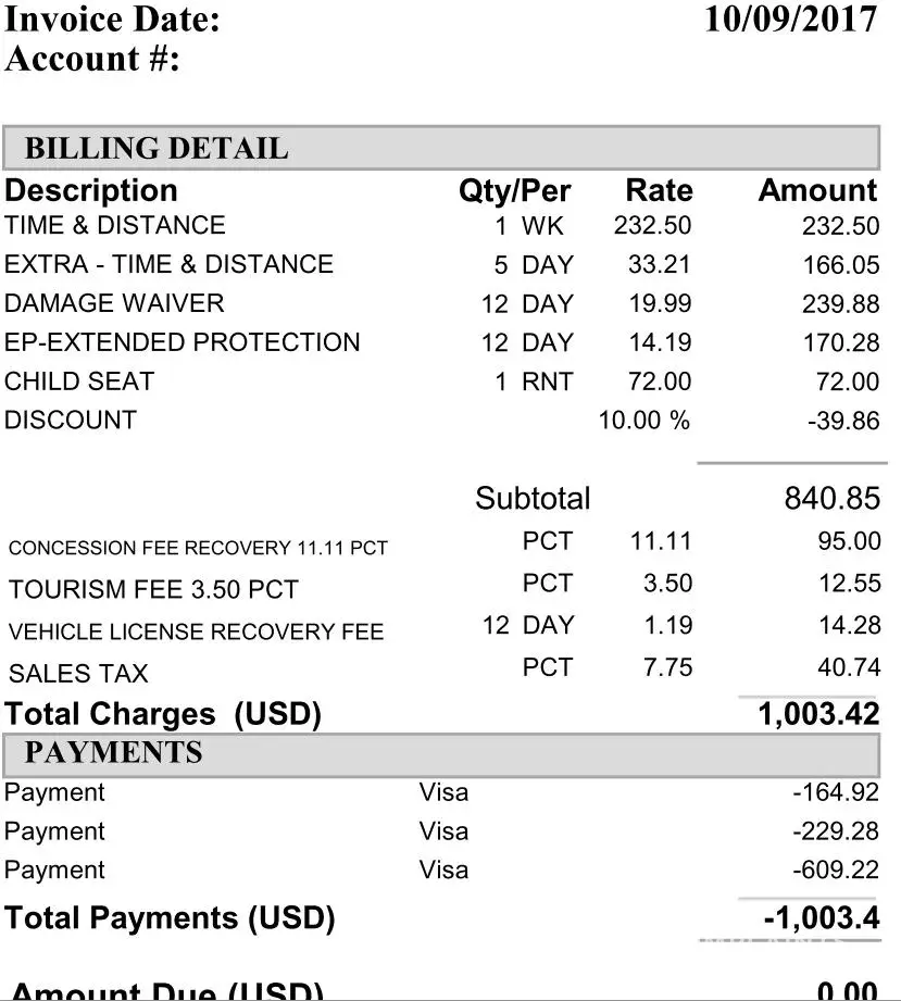 My RA # is [protected], my RES # [protected] EXT REF # R3L5YC5 . I paid some extras at the counter such as an extended protection per day and Toll pass device for the six-day rental of the car.