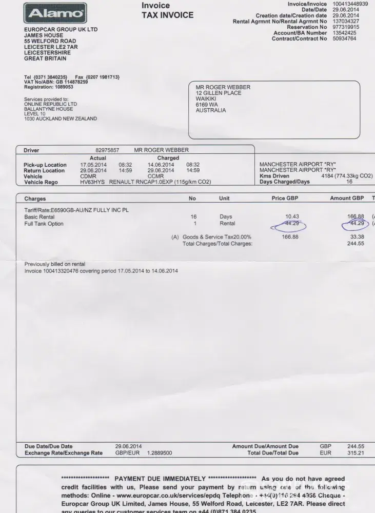 We reside in Perth Western Australia and hired a vehicle online through Europar who turned out to be Alamo car hire.The hire period was from the 17th May 2014/20th June 2014 to be collected in Manchester and returned to the same area.When we collected the vehicle we were told the tank was full and that we should lreturn the vehicle empty, no option was gived although we were informed later that we had elected to take the fuel option with a full tank, so we paid upfront for that.At some point during our vacation we were charged part of the total account for the hire period which included the sum of 44.29 pounds for the fuel.When we returned home we find we have been charged the fuel option once again, 44.29 pounds.We have emailed the company several times asking for our money to be refunded but they choose not to reply.The name is Roger Webber...12 Gillen Place...Waikiki...Western Australia...Rental agreement number...[protected]
