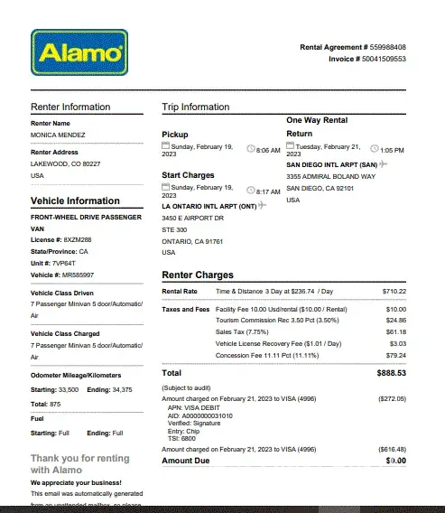 On the weekend of 2/19/23 took my daughter to see some college in the west. I rent a car from Alamo on the 19th and return on the 21th . This is not first time i do drop off cars in different location cause i travel for work and my family too. I live in Denver, CO , and i have family in the East coast , but this is my first time resting from you guys and when i saw the receipt charge was extremely high , since you guys were charging me as one way i called and explain the situation if i knew this was going to be the high i was going to risk and drive back or do something , as i mentioned before i drop off rental cars different locations and the rental vendors never charged me this high i can tell you some of them AVIS, Enterprise , etc