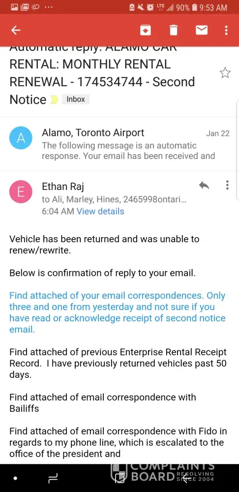 I have rented a vehicle from alamo in toronto ontario canada and have been communicated through email stating that I will be coming on saturday to rewrite/renew the contract agreement. Without any replies to my email, I have been reported to the bailiff and have almost got the car impounded during work. Automatic reply: alamo car rental: monthly rental renewal - [protected] - second notice that is the email I ha e replied to them stating my situation and when asked to speak with someone I was simply sent a reply back stating thank you from the representative. I'm not sure what kind of response or behaviour that is and almost jeopardizing my work without acknowledging my return email. Below are pictures of of the mails and more is available. Absolutely unfair and unethical. If anyone know the appropriate contact to get in touch to this please. Feel free to write to me at ethan. [protected]@gmail.com. Thank you