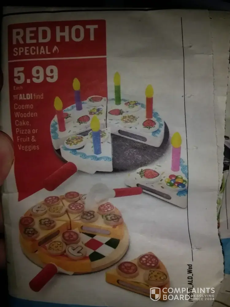 My point is why does Aldi advertises items like this Red Hot SPECIAL - Wooden toy (pizza/b-day cake/ veggies)and doesn't ship it to its stores? I understand that some locations don't have these items but I have checked almost all Aldi Stores in Seminole County, FL and didn't find them. Aldi Assosiates told me they never got these items during the advertised week. I am disappointed! I really need one!