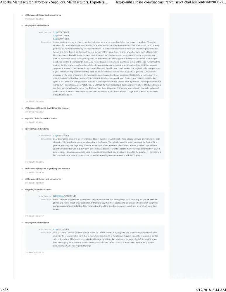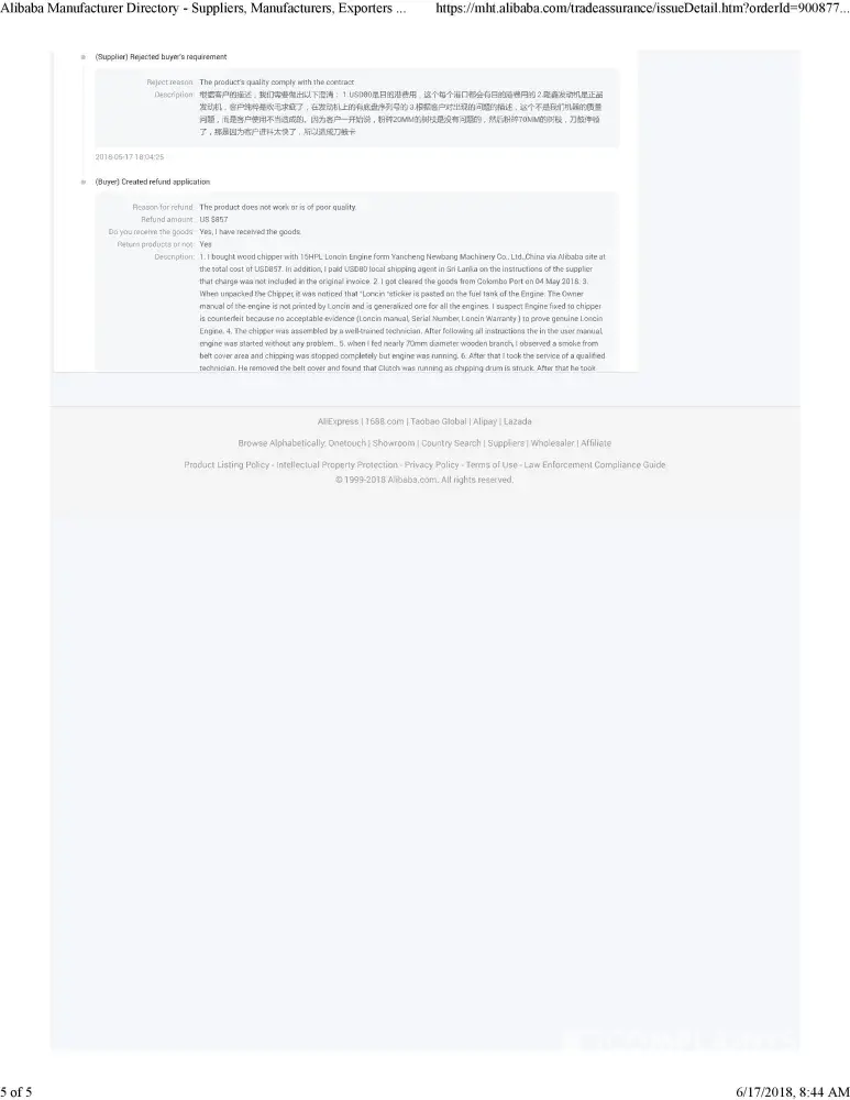 This product was defective due to manufacturing defect and Engine fixed to the wood chipper appears to be defective. I made a complaint Alibaba Trade Dispute Mediation Department on 17/05/2018.The complaint was investigated under the Trade Assurance Order No.[protected].