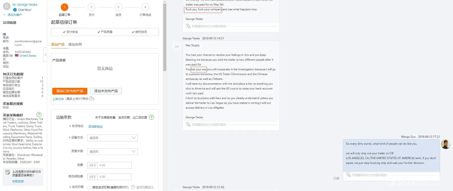 5. George gets delay for over 6 months and I didn't complain to him. but we were busy moving the factory, so I told him we will ship the trailer in 20days. But he can't accept that and ask to cancel the order.