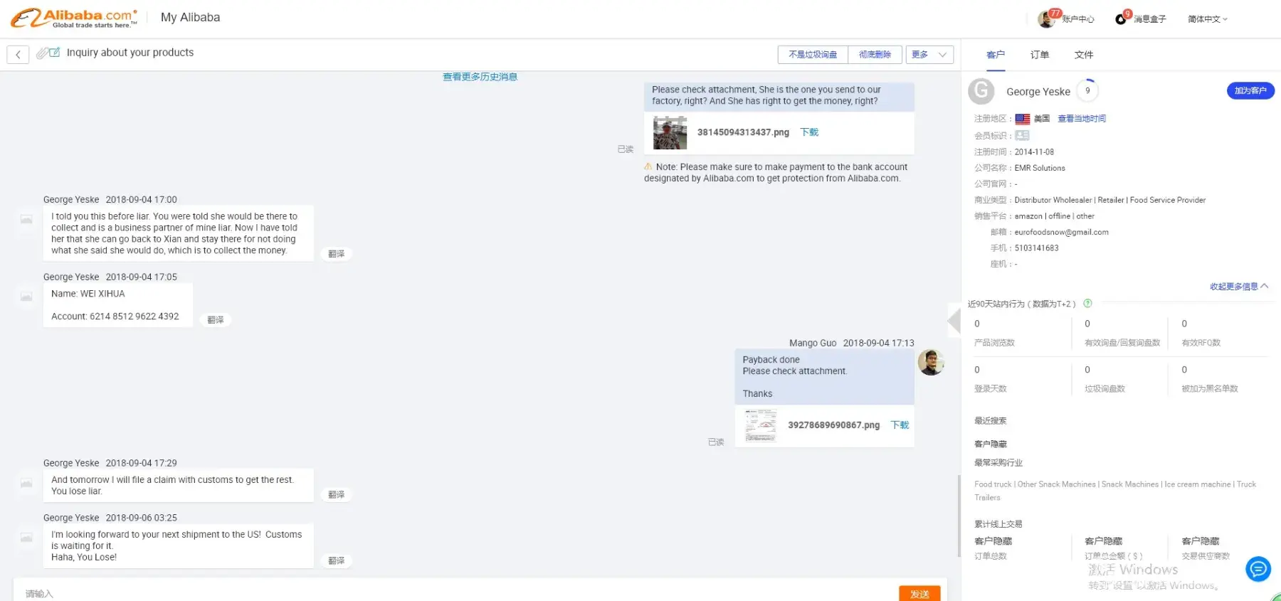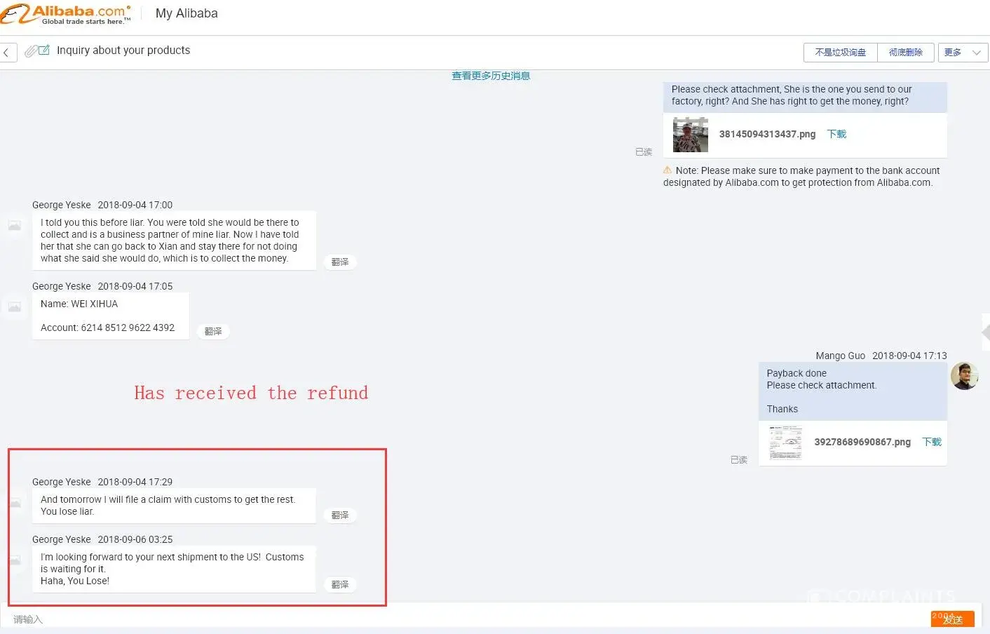 again there were trying to extract more money giving some odd reasons then i realized i am scammed . i would appriciate if you can refund my hard own money please. because ive requested a quote to alibaba offical app so the information was leaked from your end . im at attaching screen shot of the email and later if u need screen shots of whatapp chat i will do it. please refund my Rs.19020.00 INR.