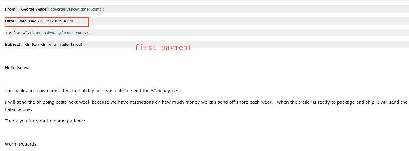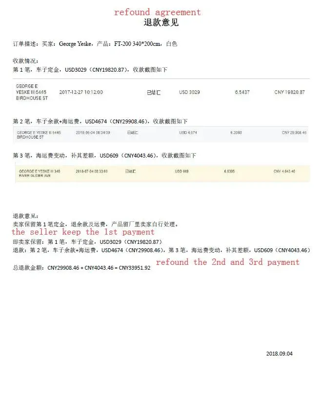 6. at the beginning I don't agree to cancel the order, because we have made the trailer for him, but he sent some people to our factory, and ask for money back, finally, we made an agreement to refund the 2nd and 3rd payment. you can see the attached picture "refund agreement"