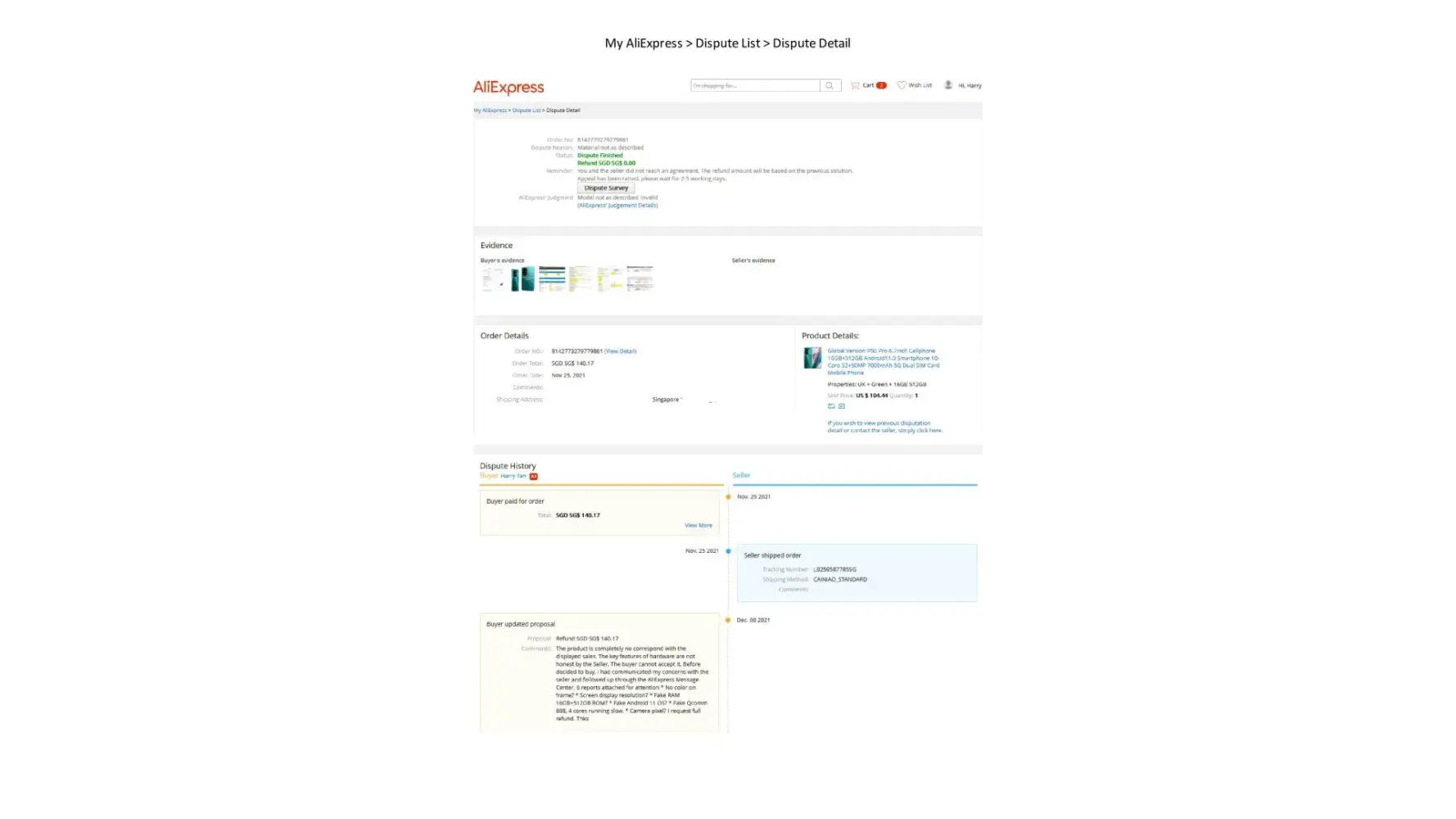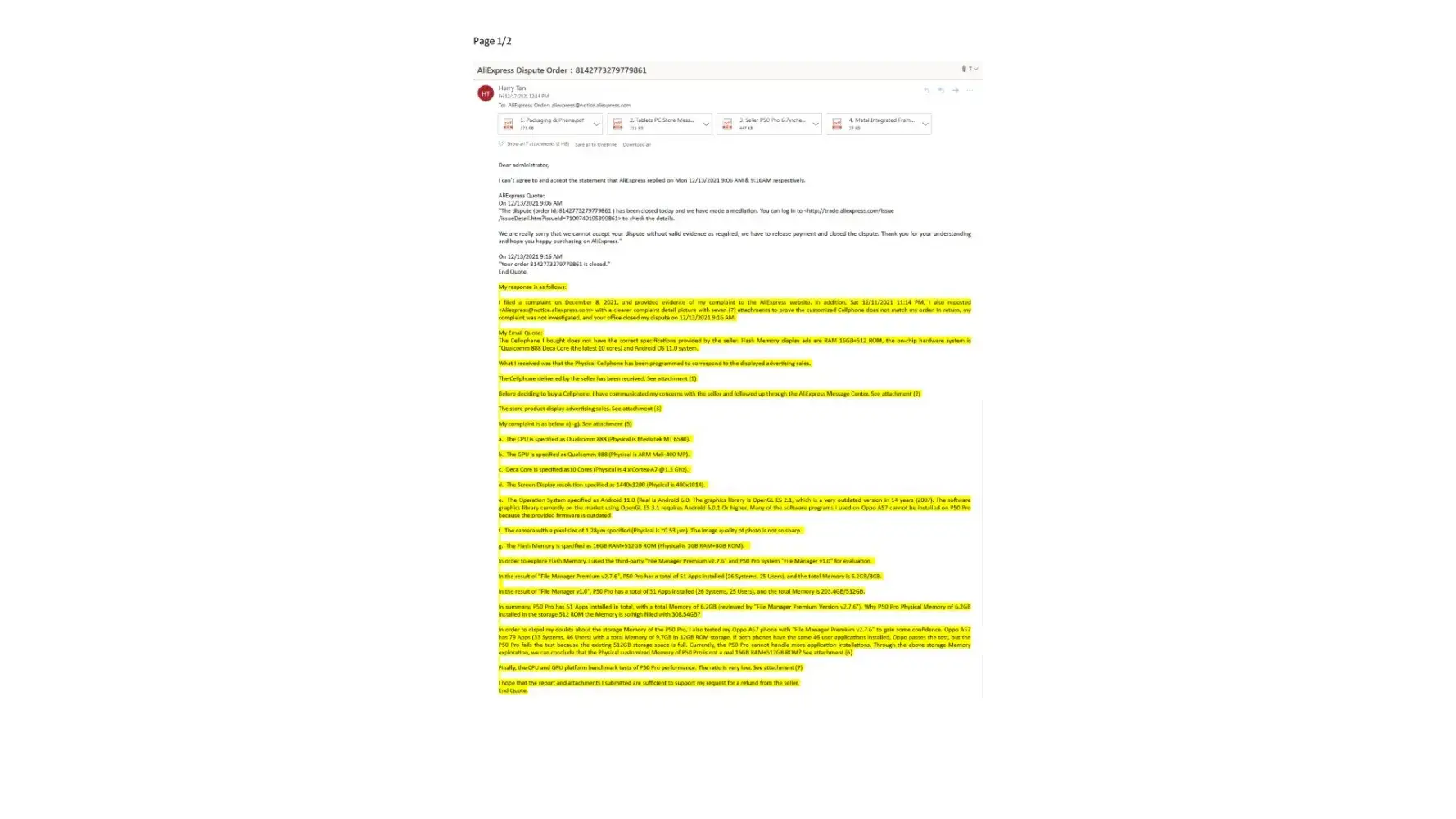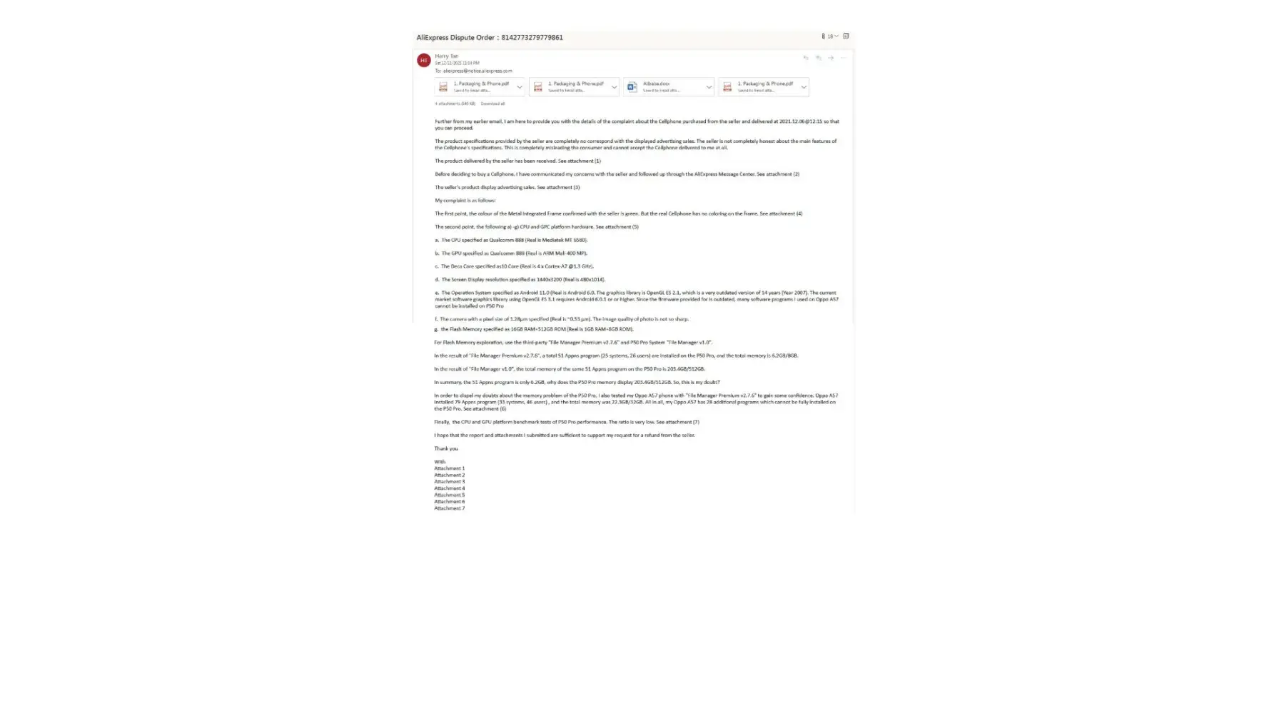 I filed a complaint on December 8, 2021, and provided evidence of my complaint to the AliExpress website. In addition, Sat 12/11/2021 11:14 PM, I also reposted with a clearer complaint detail picture with seven (7) attachments to prove the customized Cellphone does not match my order. In return, my complaint was not investigated, and your office closed my dispute on 12/13/2021 9:16 AM. See Attachment 1 - 9