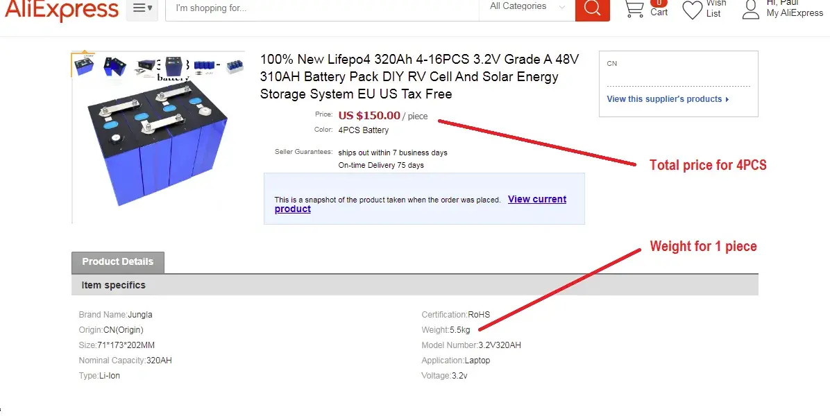 We have not received our batteries, and when we filed a grievance, your company marked it as completed. This is not the case. So far the seller has not provided useable information as to where our product is for us, just under 400.00 U.S. is a LOT of money. We wish a refund otherwise we will not use Ali express again.