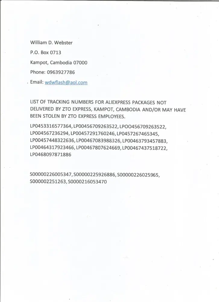For 10 years that I have been buying from the aliexpress site, shippers have been sending my packages to my Post Office Box (in Cambodia) About 3+ months ago half of my packages were shipped by the corrupt Chinese company ZTO Express (Cambodia/Kampot, Cambodia.) In 3+ month employees of ZTO Express, Cambodia/Kampot, Cambodia stole 18 packages! I went to the ZTO office in Kampot, Cambodia and it was a mess. Packages scattered all over the floor. My address on my packages has always been my Post office Box in Kampot. The Post office in Kampot is about 2000meters from the ZTO office. All the ZTO employees had to do was phone or walk over to the Post Office and tell them they had packages for my Post Office Box. ZTO (Cambodia/kampot, Cambodia) employees were more interested in stealing the 18 packages than delivering them.