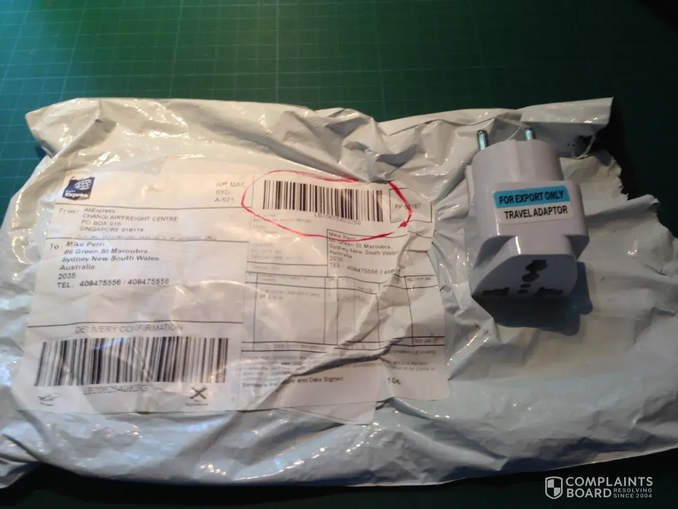 (2) Checked with Australia Post - verified that an item was sent. However, I indicated that I had received nothing. During discussions with the AP Officer, it occurred to me that in fact I did receive an item- a standard European power plug! I did not order this item.
