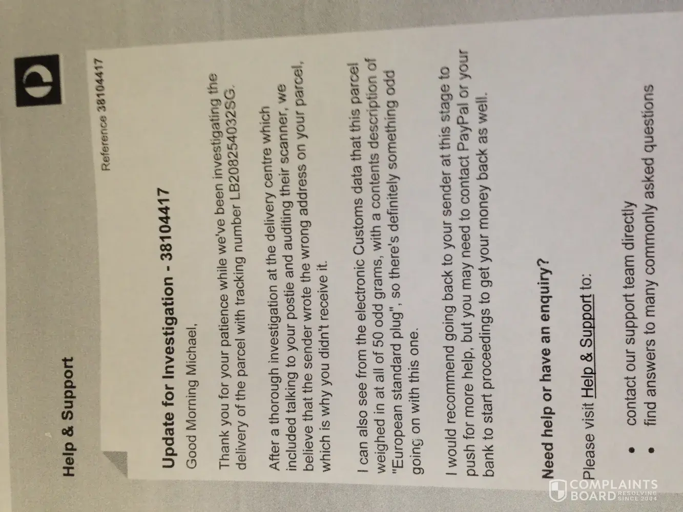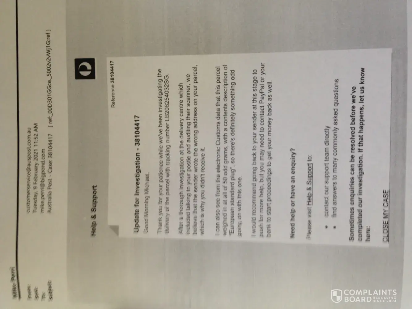 (4) Please find attached a copy to the Australia Post report on the investigation and a photo of the packaging and the item sent to me which I did not order. What I did order was an angle grinder attachment (for a power tool) - nothing like what sent. Cost around $AUD58. Is the cost of a European power plug $AUD58? I don't think so!