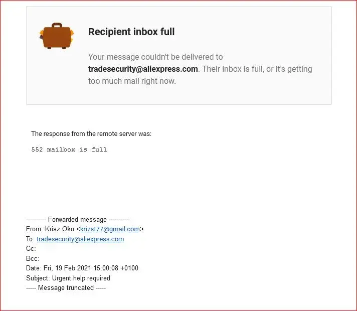 5. After sending messages to Aliexpress all I got was a statement that their email box was full and my messages could not be accepted.