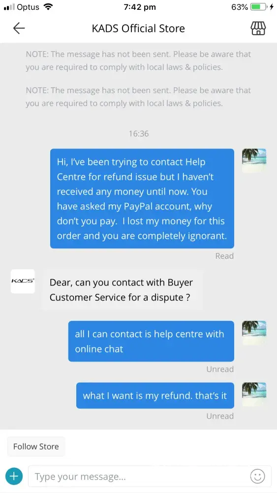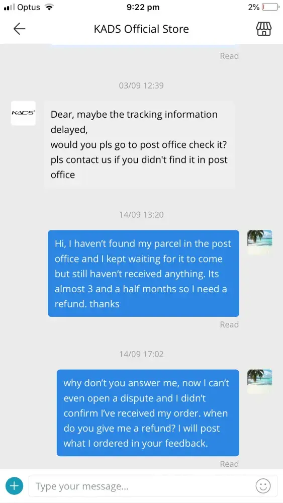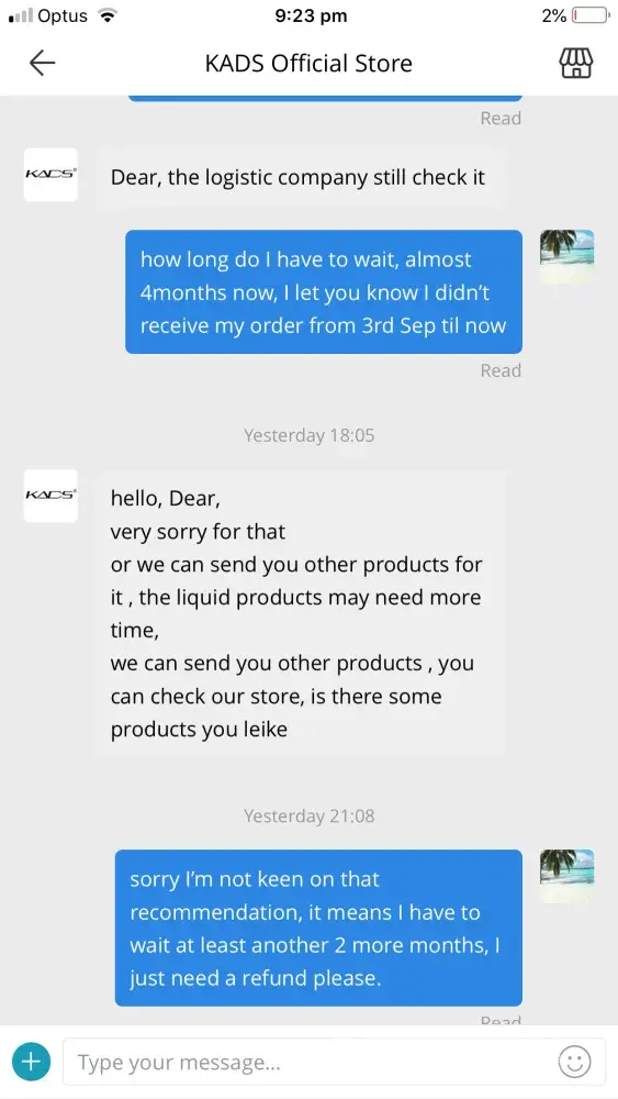 I've made an order on 25/05/2020 for KADS stamping polish, Order No is 8014607460936394 and I haven't received my order after 3 months, I didn't realize my order had passed protection time but the seller didn't extend protection time so that I could open a dispute after not receiving my order. i have been contacted seller for a refund, seller offered to resend products to me. I said what happen if they get lost again and seller changed his/her mind to ask my Paypal account . 2 days later, seller change his/her mind again to offer me other products instead of my KADS stamping polish (seller said: because they are liquid, it takes long time to get to Australia).