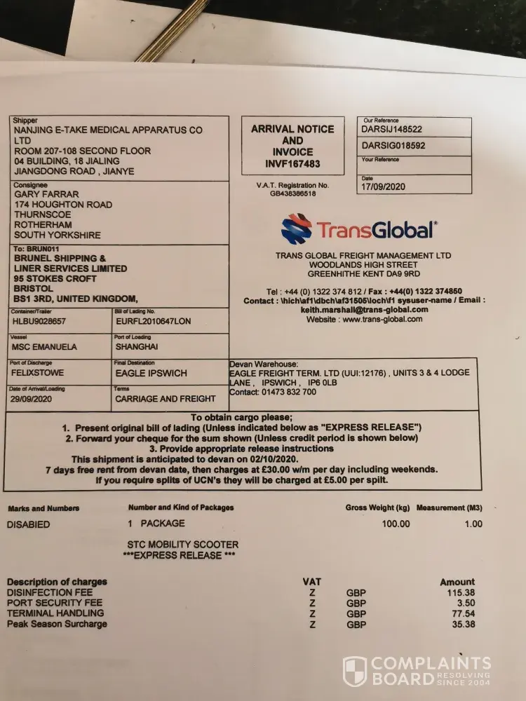 Order time: 09:49 Jul. 12 2020, the order was sent out to the china sea port and I was sent the b/l number for tracking it, but was not put on the ship as the shipping company coscos refused it because it had got battery's on the scooter and they cannot transport batterys`s, no one told us this until I waited 4 weeks when the ship arrived in the uk port only to find out the mobility scooter was not on the ship, the seller told me we had to put it on another ship, so now I had to wait another 4 weeks, the mobility scooter as now arrived at Felixstowe shipping port UK. I ask the seller to send me the B/L number for tracking it, they sent me the details so I contacted my shipping agent Brunel shipping london to let them know, Brunel shipping sent me emails to let me know they will be taking over the cargo and get it through customs and deliver it to my home, then they sent me all the invoices that had to be paid before they could proceed with the order, when I got all the invoices I ask them to check if that was wright, yes they say but they did tell me they will be checking up on the invoice from the china shipping agent that was for £466.77 as they could not work out what the charges was for, my invoices are > £466.77 china shipping £231. my broker fees for import and delivery, this is ok and no problem with this, £112.35 for VAT import (we will be claiming this back as we are disabled and do not pay VAT for goods that are for disabled use only) £25 for use of deferment. TOTAL= £835.12 paid in full on the 7/10/2020 please see all attachments invoices, we are looking to claim back the £466.77 that we was not told about or what this is for.