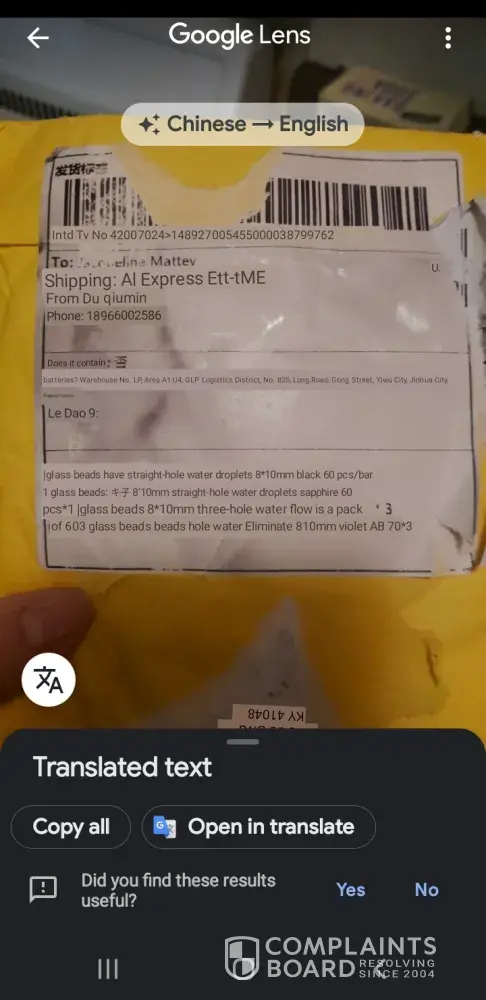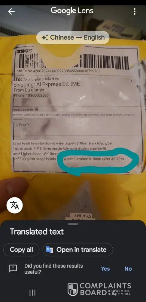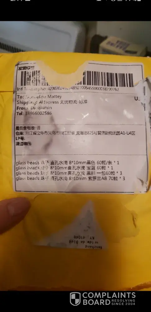 I received my package yesterday 9/3/2020 but it was missing 3 packs of violet beads. There was a label from my post office covering up the aliexpress label. I managed to expose the original label. I translated from Chinese to English and it clearly stated to eliminate the violet beads. Those are the ones that are missing. I opened a dispute and uploaded all my evidence including the original and the translation. Aliexpress found my claim invalid. I've been missing a lot of items lately and I dont want to shop with aliexpress any longer