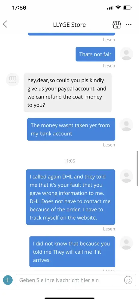 I ordered a jacket one month ago and the seller told me in the beginning to send him my phone number because when my package arrives DHL will call me to pick it up, so i waited. Today i called DHL and i was told that my package was sent back because i never picked it up and they informed me that the seller gave me wrong information because it's not their job to call the buyers to inform about the package, i have to track it myself on the main website. I didn't know that so this happened. Now the seller wants the shipping fee money back even if it was not my fault that i was wrongly informed of him. Now he even wants my paypal bank account to refund the money for the coat even if i didnt pay it yet. Here are proof pictures for you so you can understand.