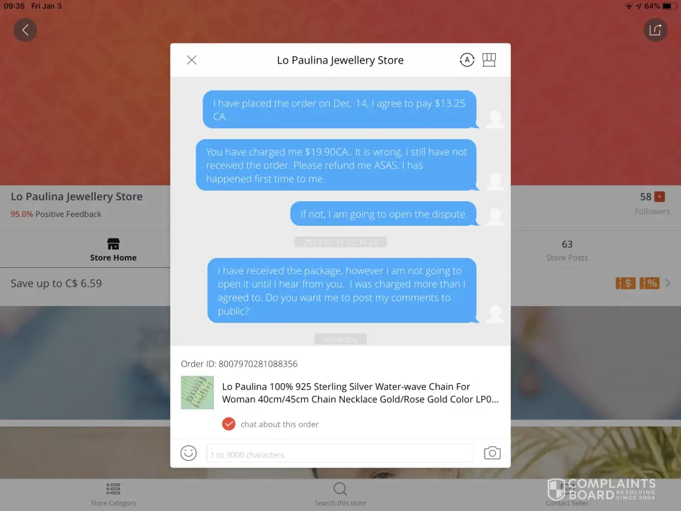 On Dec 14, 2019 I ordered 2 sterling Silver chains, total price with Shipping was C$ 13.25. When I got my credit card bill, I noticed I was charged C$ 19.90. I did not authorize that amount to be paid. In my eyes it is a fraud. I have been trying to resolve this with the store, but they did not respond to my questions.