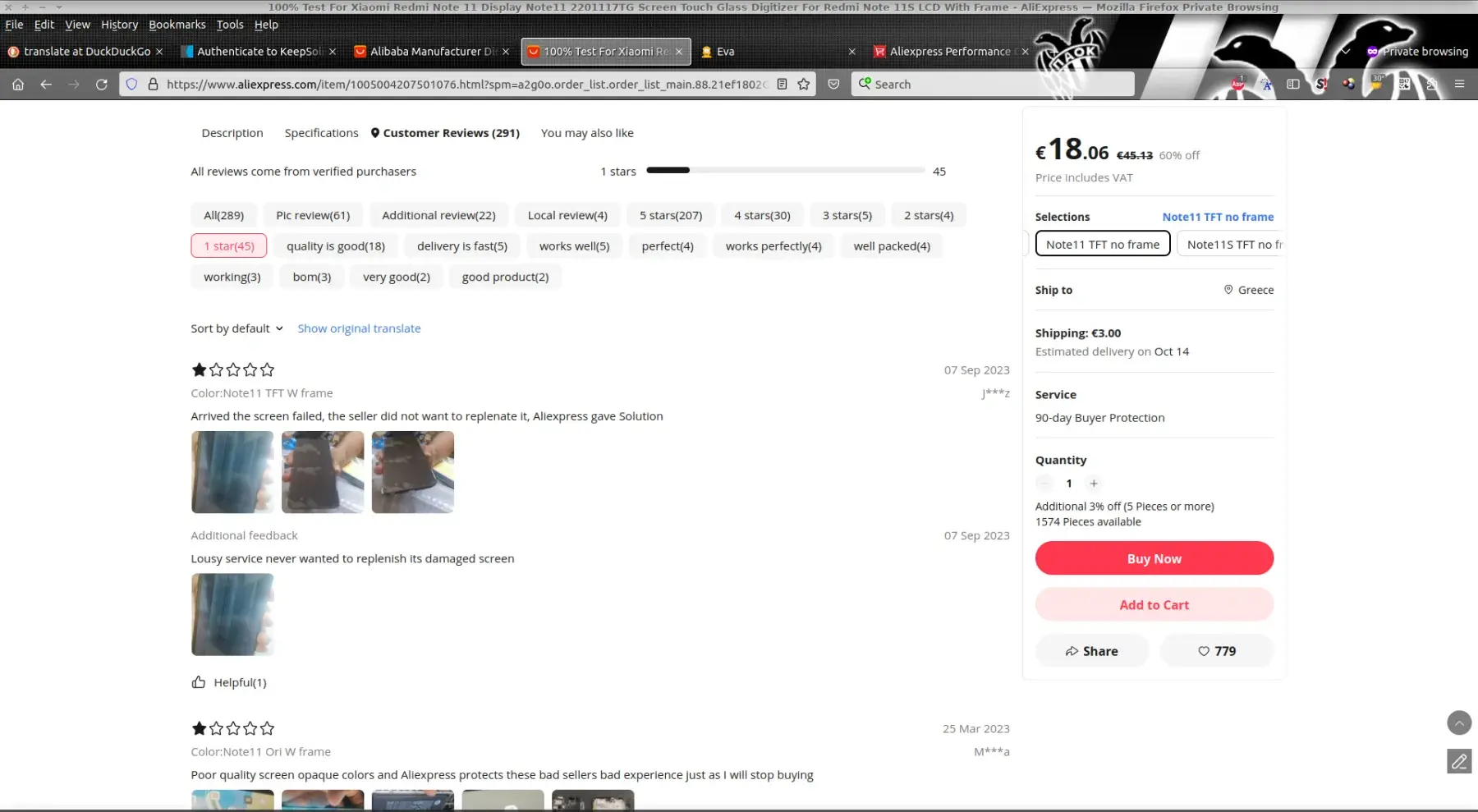 On 2/8/2023 I asked them if they can refund the amount to place a new order to have the buyer protection again. Then they proposed to Leave them 5 star review and then they will send me the new screen with the new tracking number. I've followed their suggestion and I've left the 5 star review. Then on 8/8/2023 they send me a video from a screen that is tested. Since 3/9/2023 I didn't received the new Screen and I asked seller if they can give me the shipping number. On 5/9/2023 they send me the message "Dear, I help you to consult the logistics information". After that message they never send me the shipping number and also they have blocked me in the chat. Every message that I have send since then I'm getting a system message "Sorry, they cannot receive messages from you.". I've never offend them with my messages. From a 290 total reviews they have 45 with 1 star. Many of them report the same problem I've tried to find a solution via chatbot, but always says the 15 days to dispute has passed, contact with the seller. Also on the product page there mentioned the 90 days buyer protection.