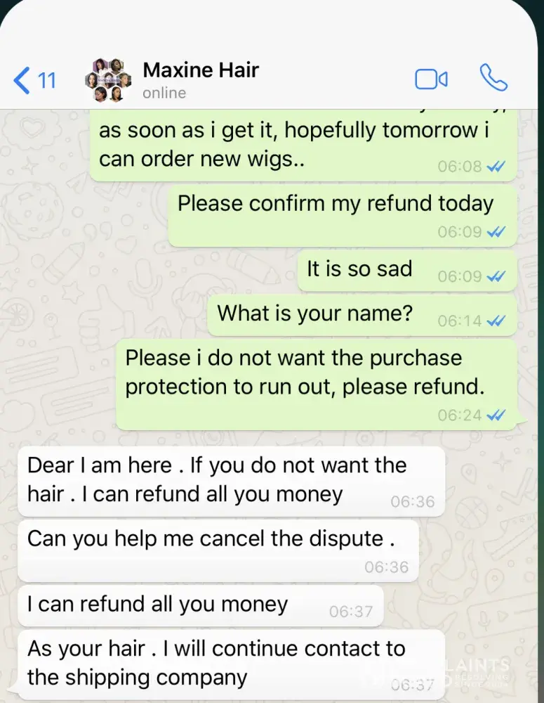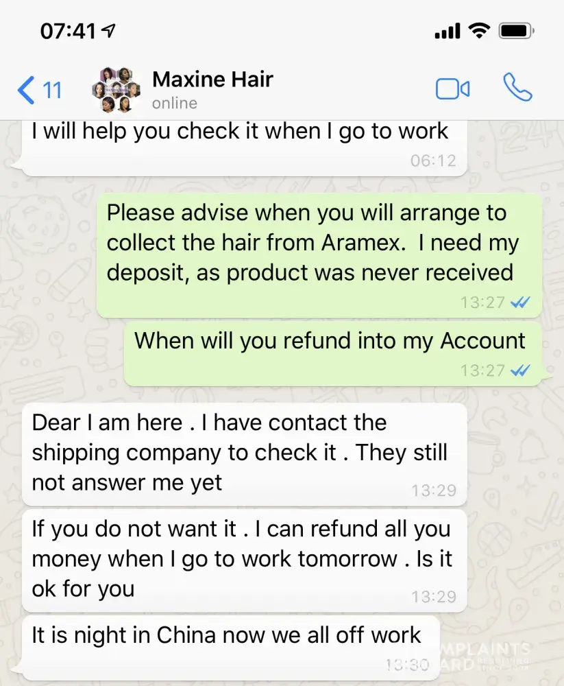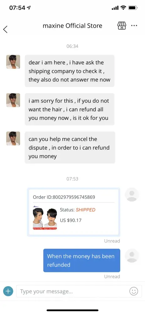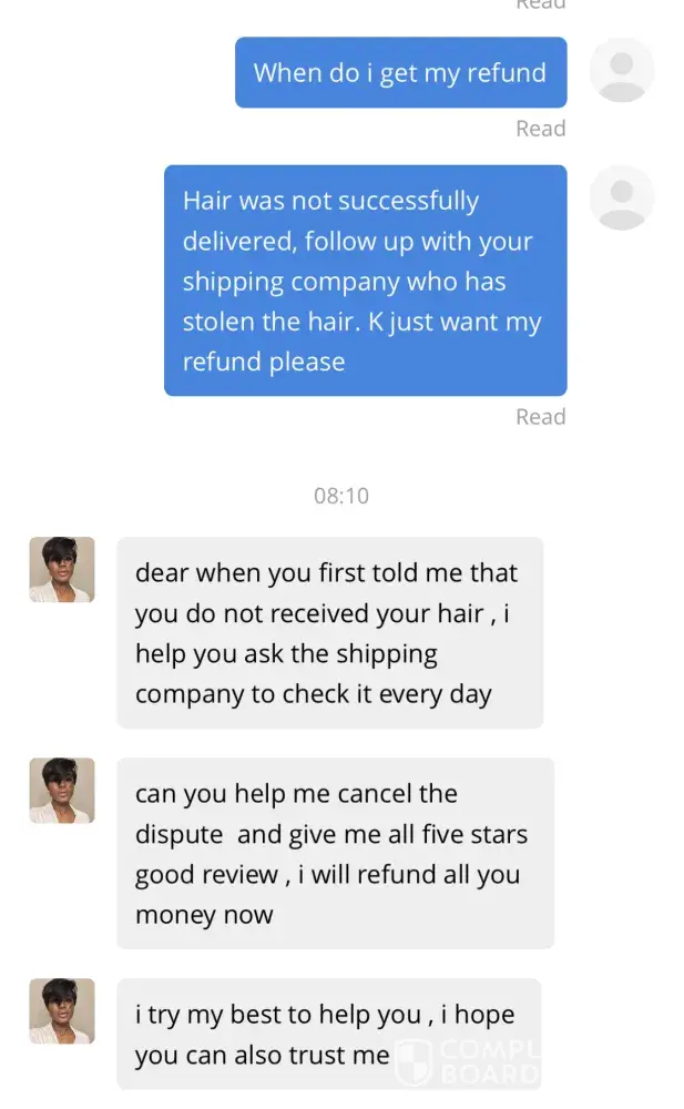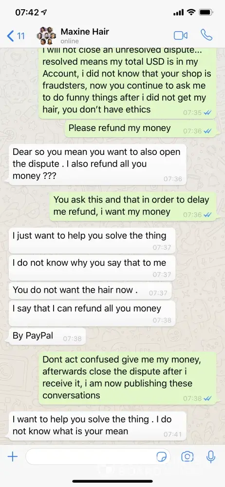 I would like to save you a big loss, never buy from Ali Express from a shop called ‘ Maxine Hair Store', they will not give you your refund if the hair is not shipped. Aliexpress and seller marked my goods as successful delivered, my order ID [protected] when i had not received my goods and they had failed to reach their own shipping company Aramex, later the seller pathetically told me i should go to the website to mark that i had received the hair and put 5* for product and service, when i had raised a dispute and want my money. How unfaithful, how unlawful, how disrespectful to think Chinese stores can consider the African Continent as having stupid buyers to try and treat customers as such. I am still fighting for my money... please be careful they will steal from you too...