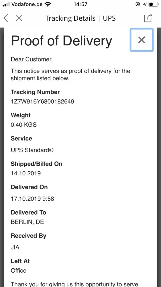 Unfortunately the postoffice told me they had already sent it back to the Fay store. Since then I am in contact with the Fay store who says that they still have not received the product and that I should ask for a refund. But when I ask for a refund I get a message saying that I cannot open a dispute because of timeout.