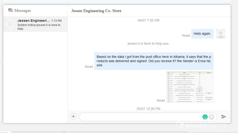Attached are pics of our conversation and status confirmation of the delivered item from the Albanian post office.