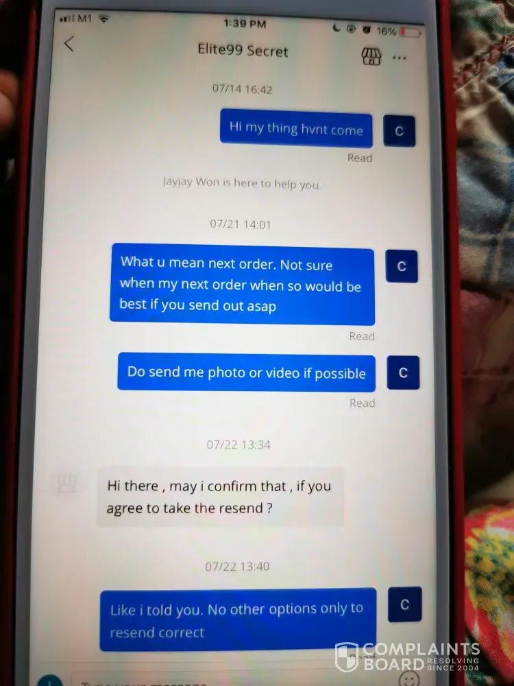 Contacted seller on 14th July, took a week to reply on 22th July. Jayjay Won was the one assisting. Asked for refund but seller keep wanting to resend. Contacted seller on 27th July, item not received yet. Replied me with it's ok.