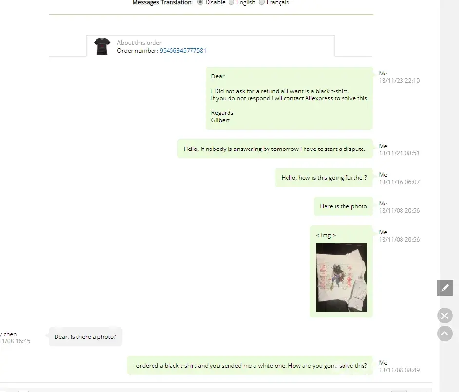 Attached a photo of the "white" T-shirt and the chat with the seller.