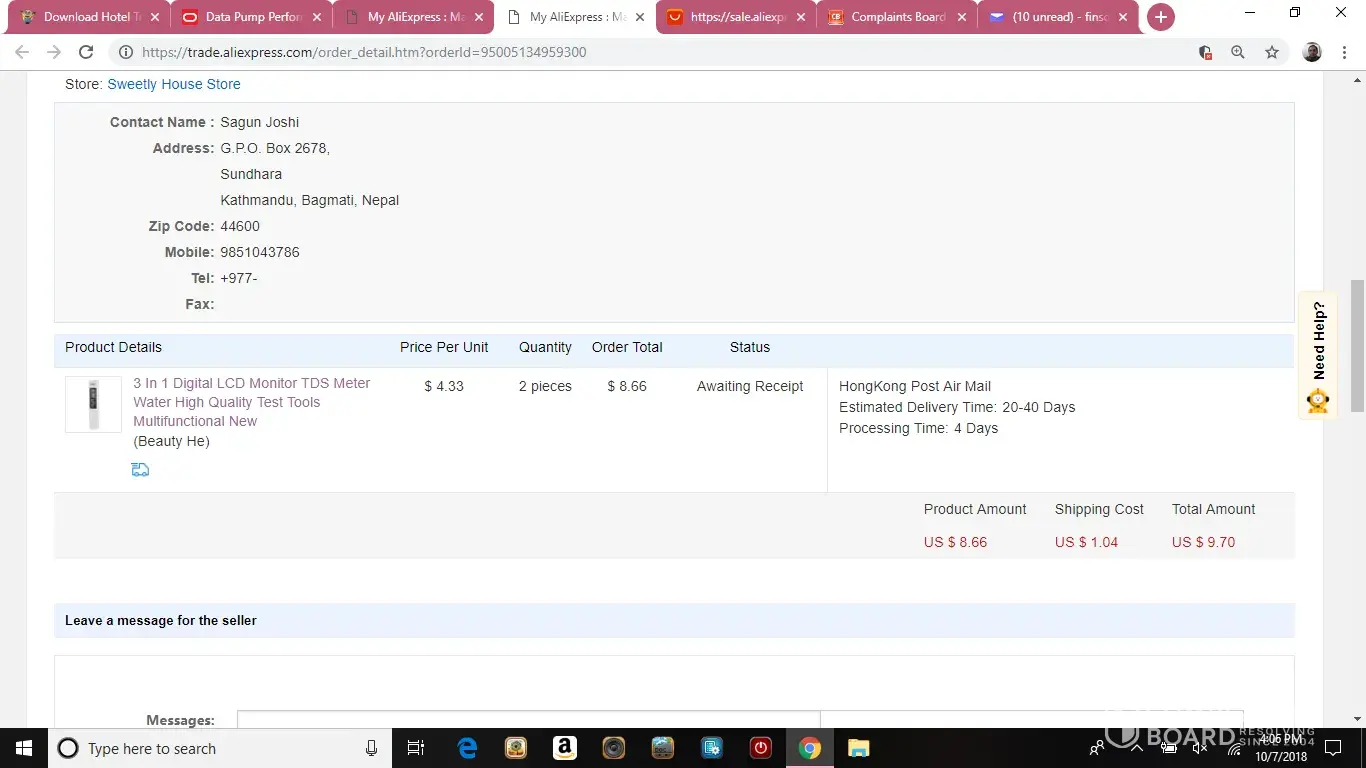 After showing clearly the information from the tracking number which says that the address on the package has a problem and spent only three hours on delivery has been sent back to the seller because the post office cannot figure out the address to be shipped to. Even though they have all the info clearly written on the official website for the tracking number I have being assigned the guilt of I don't know what but they said it's my fault. This is ridiculous. They don't have a phone number to complain and reason with someone