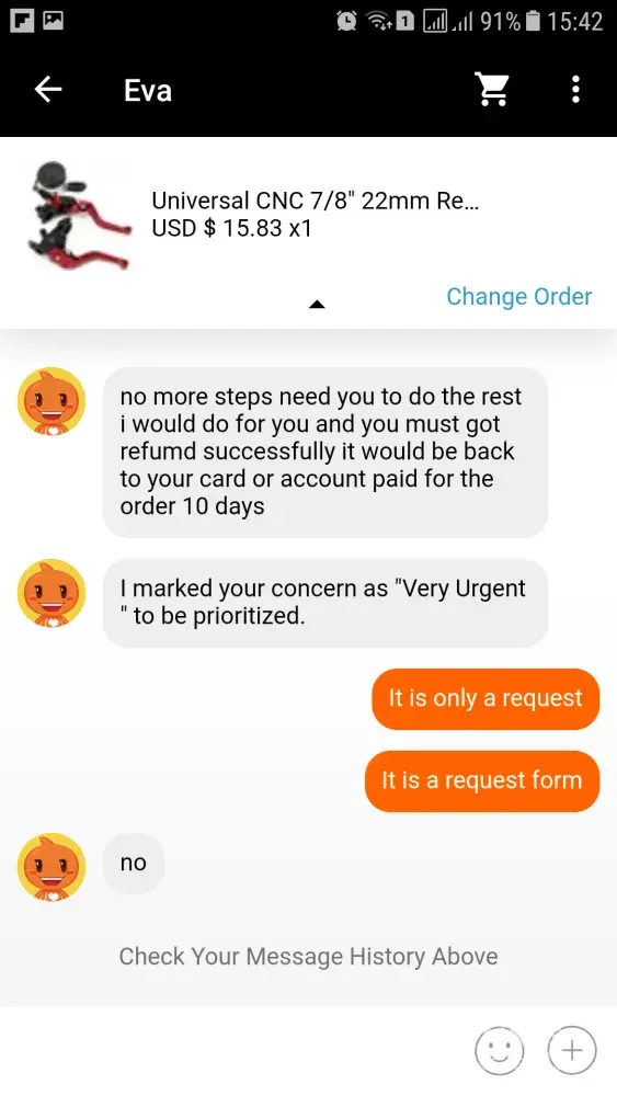 I learned a lesson along time ago. If you make dealing with you far more difficult than resolving the dispute you will get a positive outcome. This is what I had to do in this case. Ali-Express system is terrible. The customer service agents keep making statements like I understand or I am here to resolve your issue, when in fact they do next to nothing. My issue should have been dealt with at the first communication. The seller breached the contract I entered into and all I wanted to do was cancel the order. Instead what ensued was a 15 day battle to get the order cancelled and my money back. I would like to see what sanctions they impose on the seller for messing me around. I would like to see the customer service agents given the power to force a seller to act in the buyers favour when they misbehave towards buyers. The buyers money is upfront on day 1. Overall, I am happy with Ali-Express in that every dispute I have opened has had a positive outcome in my favour. You just need to understand that working within the Ali Expresss system is the only way to resolve your issues. Agents appear to be unable to circumvent the system. That system needs a hell of a lot of improvement.