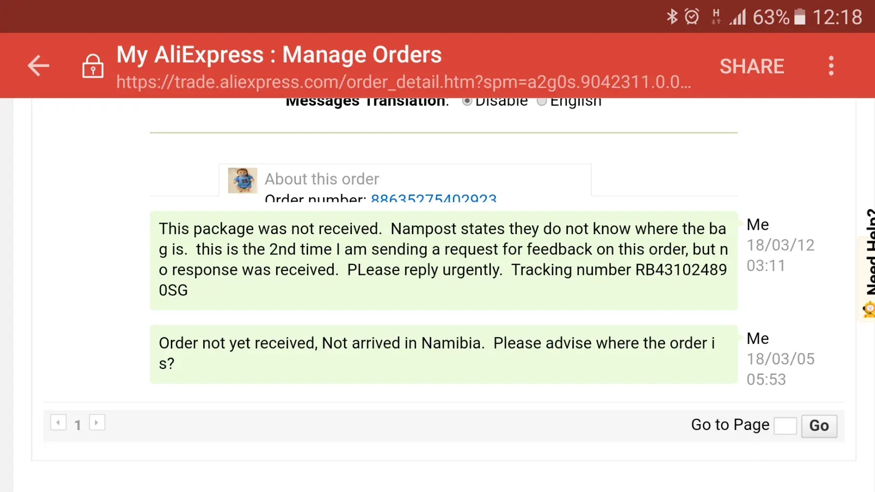 order not received in namibia, shows as 'confirmed receipt' on website, so I cant submit dispute