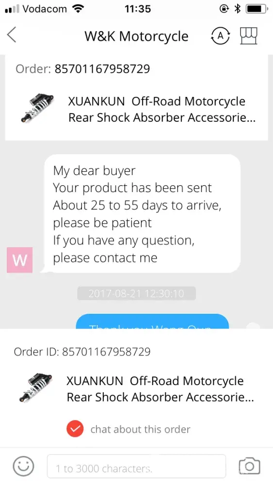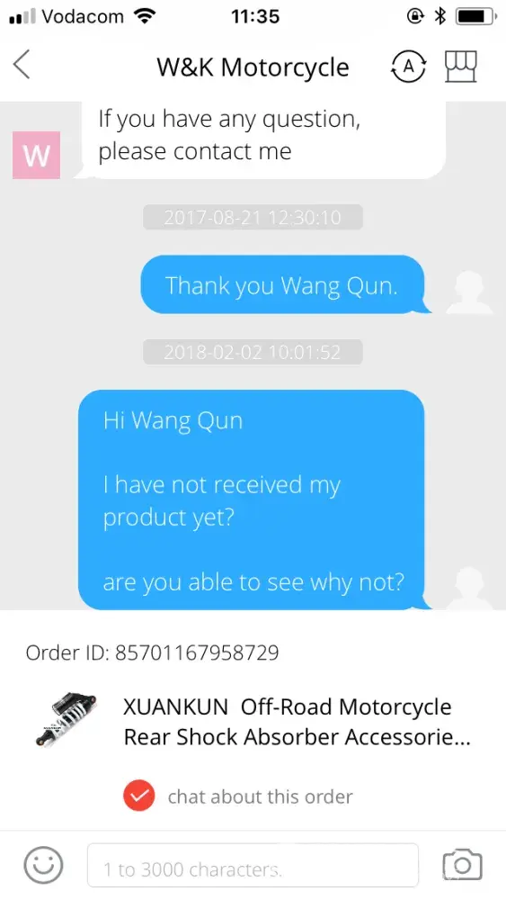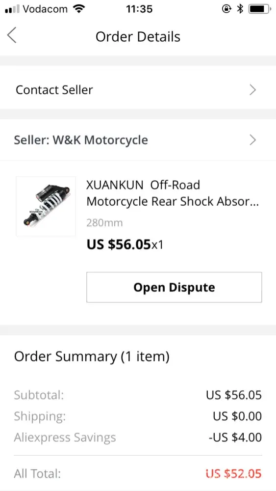 I bought this shock absorber from ‘W & K motorcycle' on Aliexpress. Once payment was processed I was told by seller to be patient in awaiting the receiving of the goods. After 4 months I contacted the seller to query my order. I did not receive a response. After a month following that, I again asked on progress. He then told me the item may have been lost. When I tried to open a dispute on aliexpress I was not able to do so, as ‘disputes can only be opened up to 15 days after you have confirmed receiving your items'. At no point did I ever confirm receiving the goods on the app or website. I have now lost $56, with no option to dispute or request a new item. If this is not resolved I obviously would never consider using aliexpress again, despite it having a great range of products.